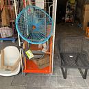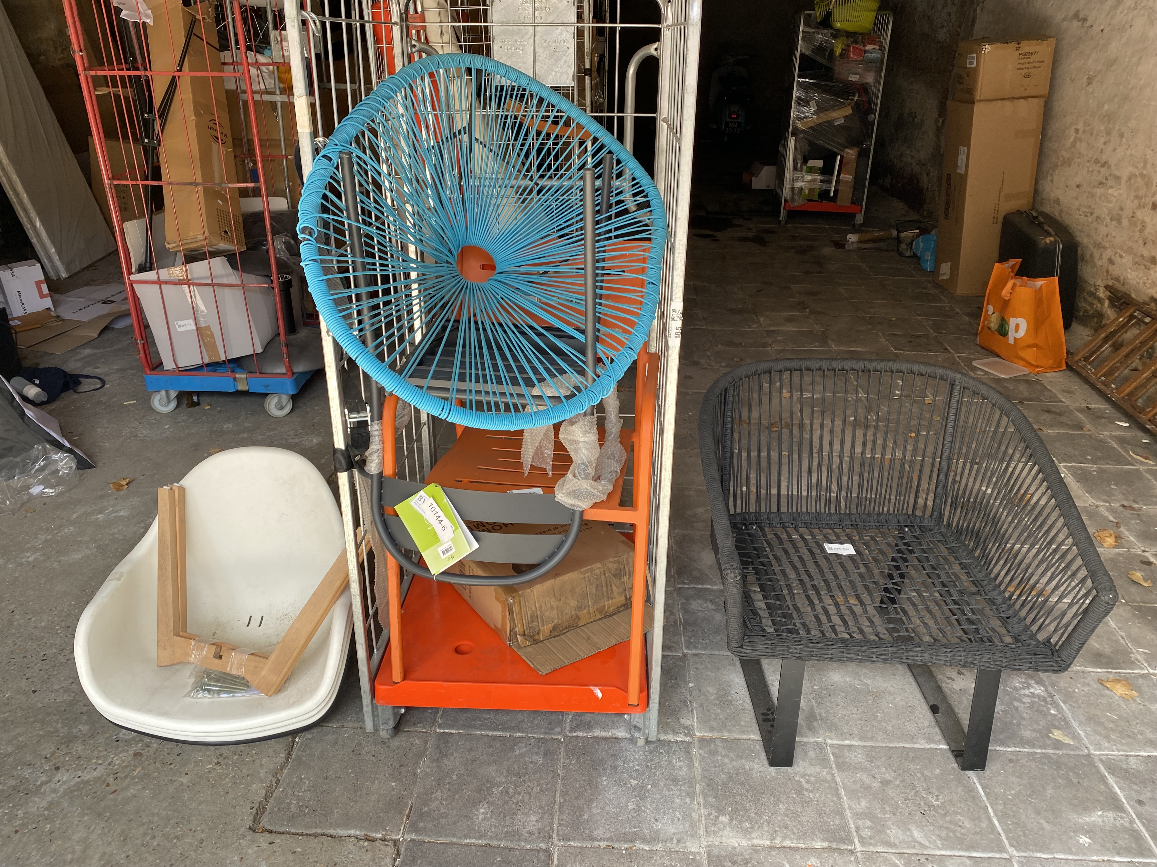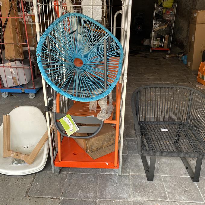 1 Rolcontainer met 3x Zweedse stoel wit, 1x Zweedse stoel zwart, 1x blauwe gevlochten kuipstoel, 1x zwarte gevlochten laagzitstoel, 1x oranje metalen stoel, 1x antraciet metalen stoel