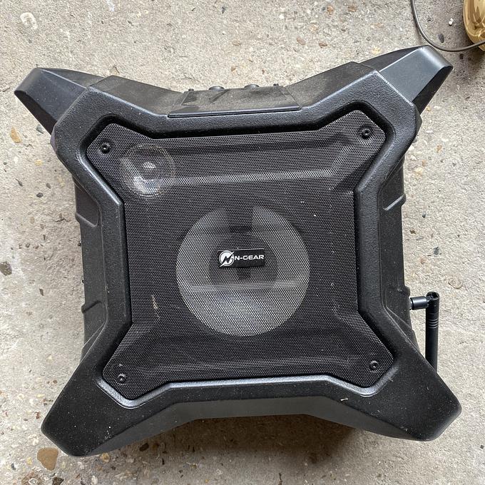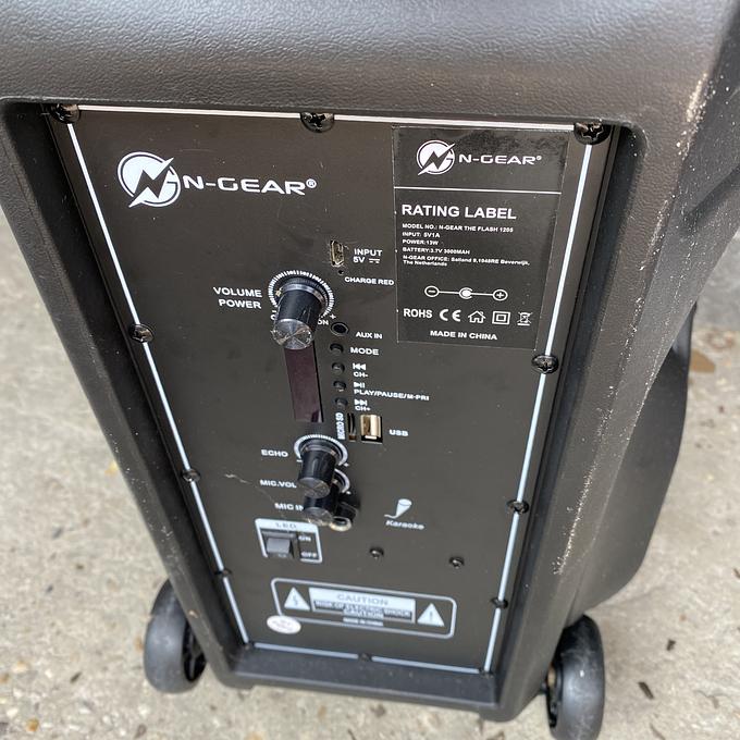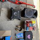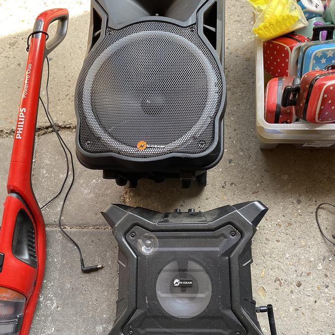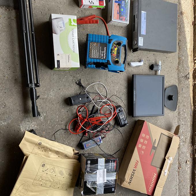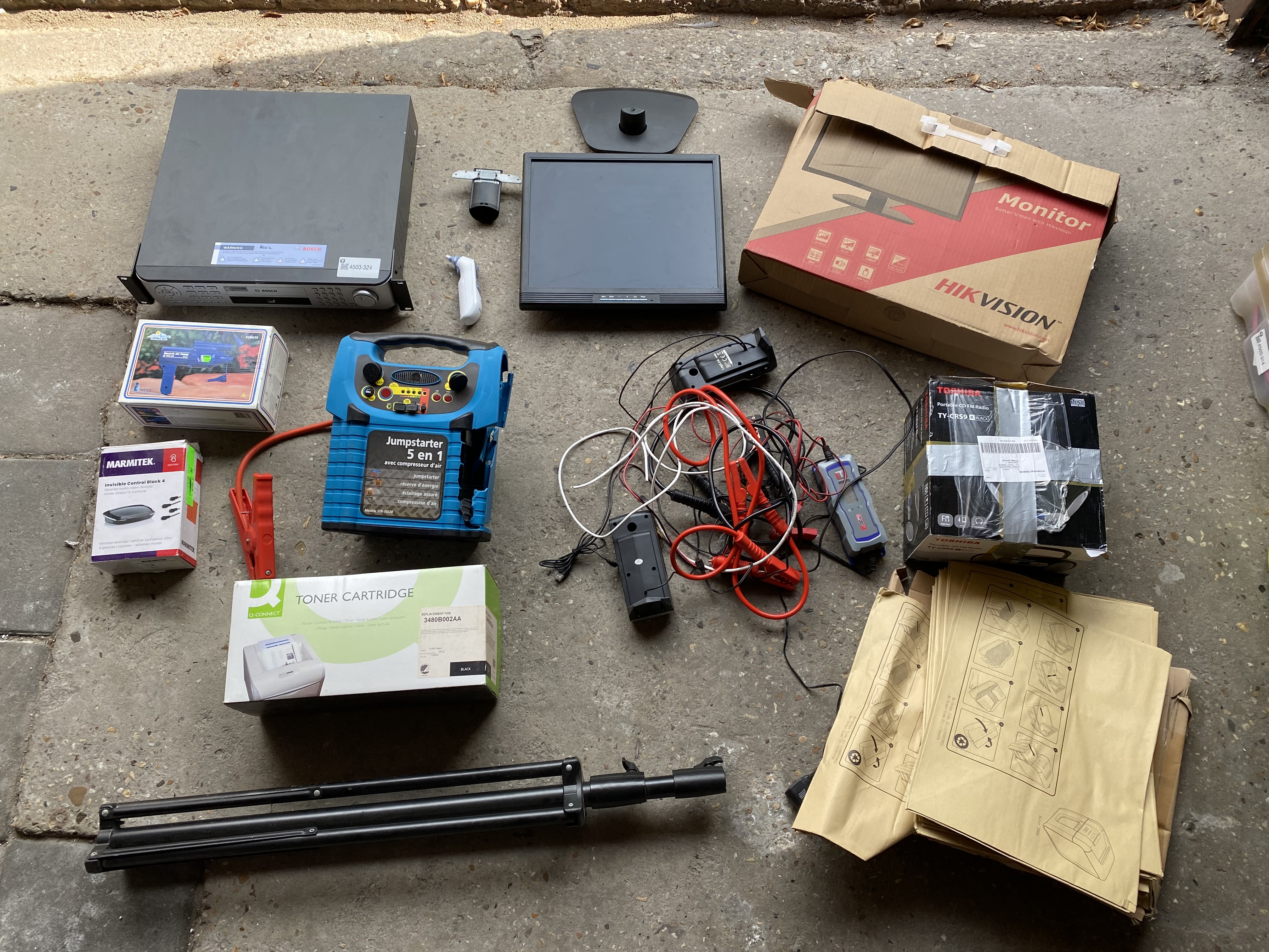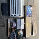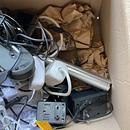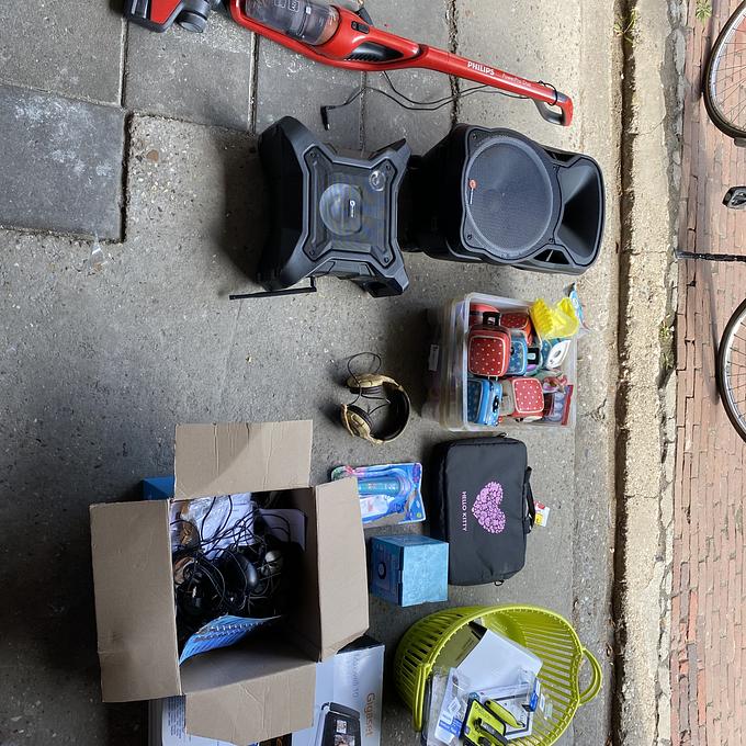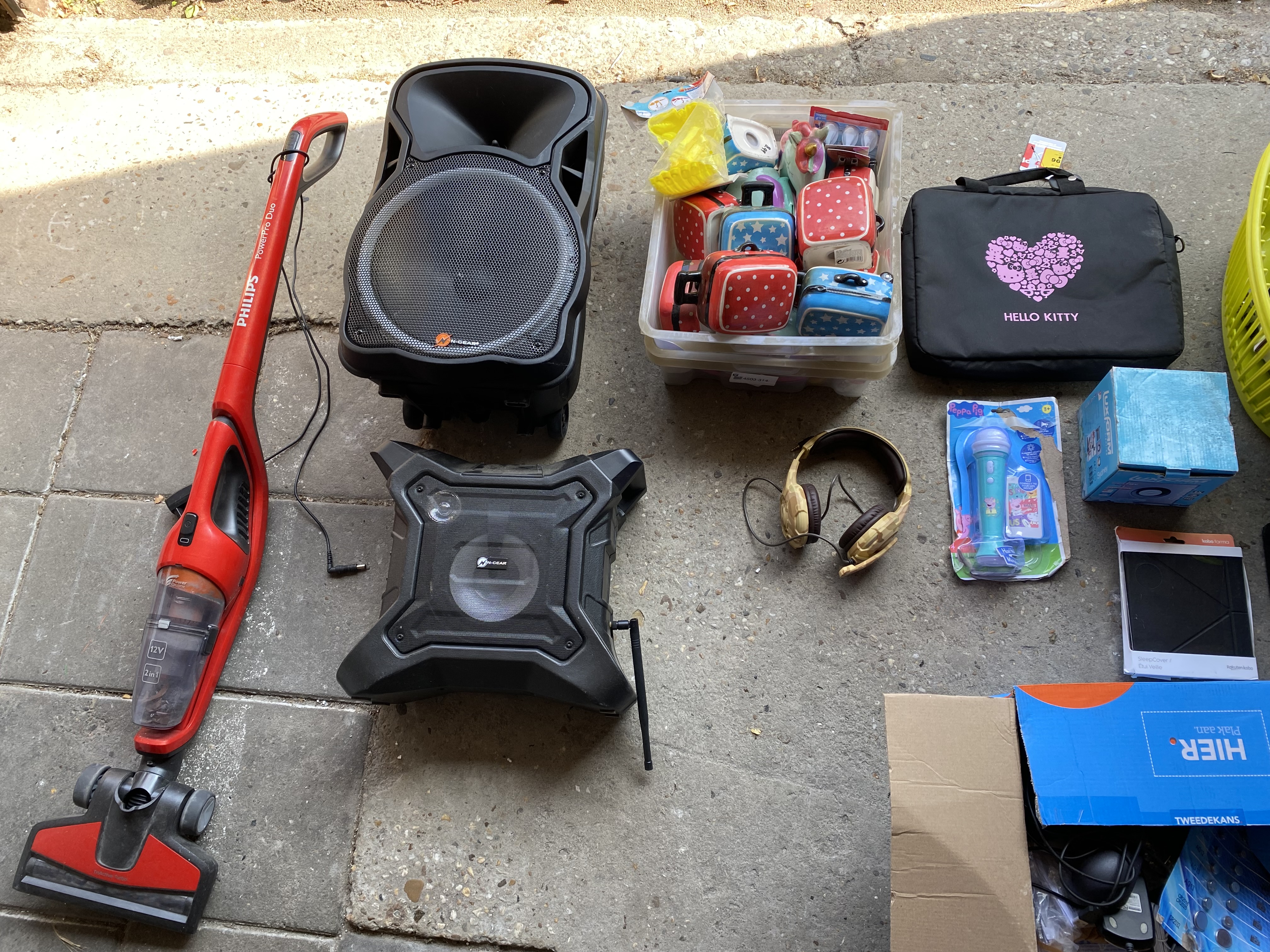 1 Rolcontainer met o.a. monitoren, stofzuiger, N-Gear speakers, zie foto's voor details