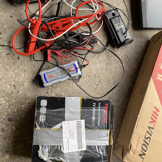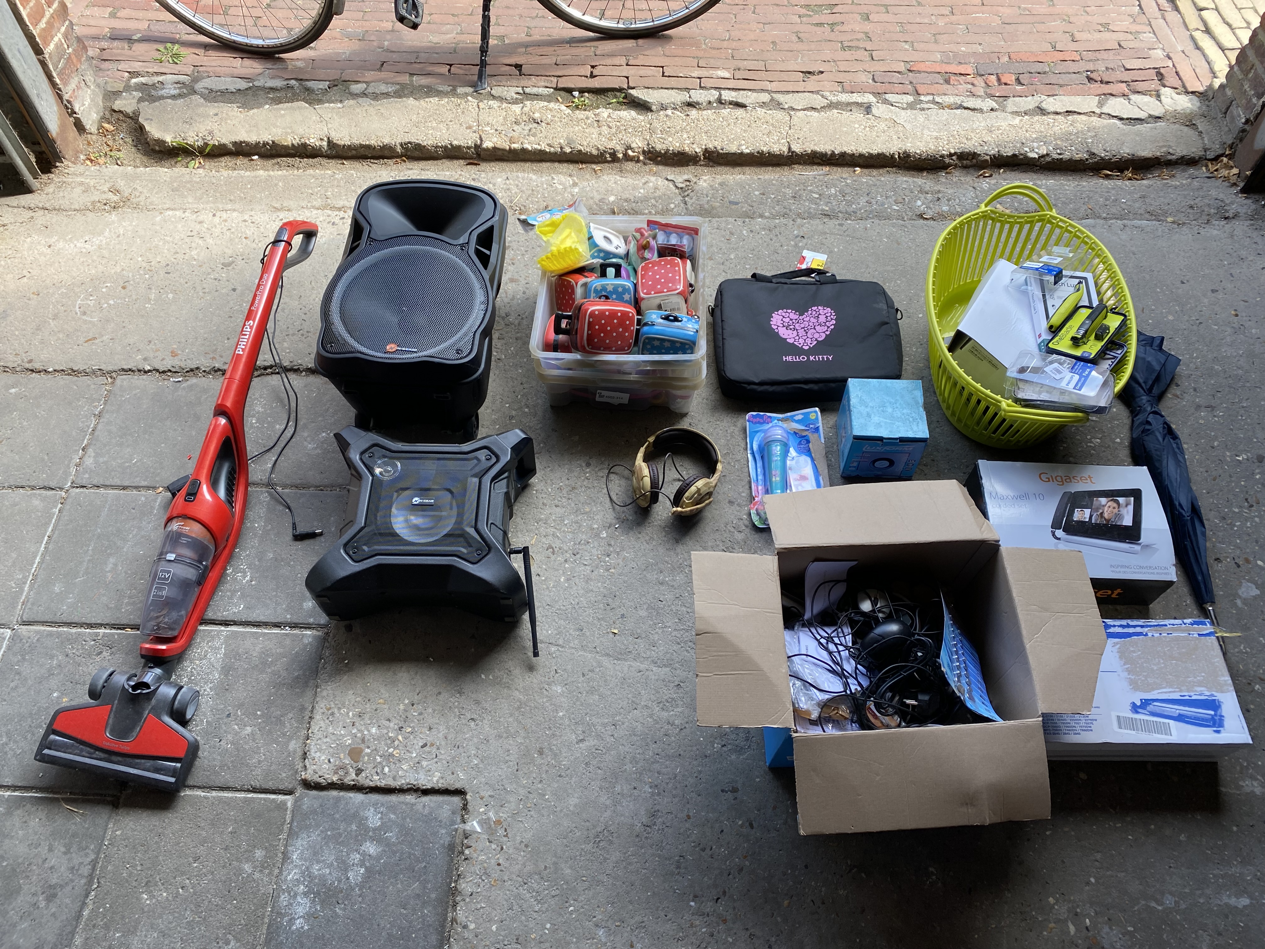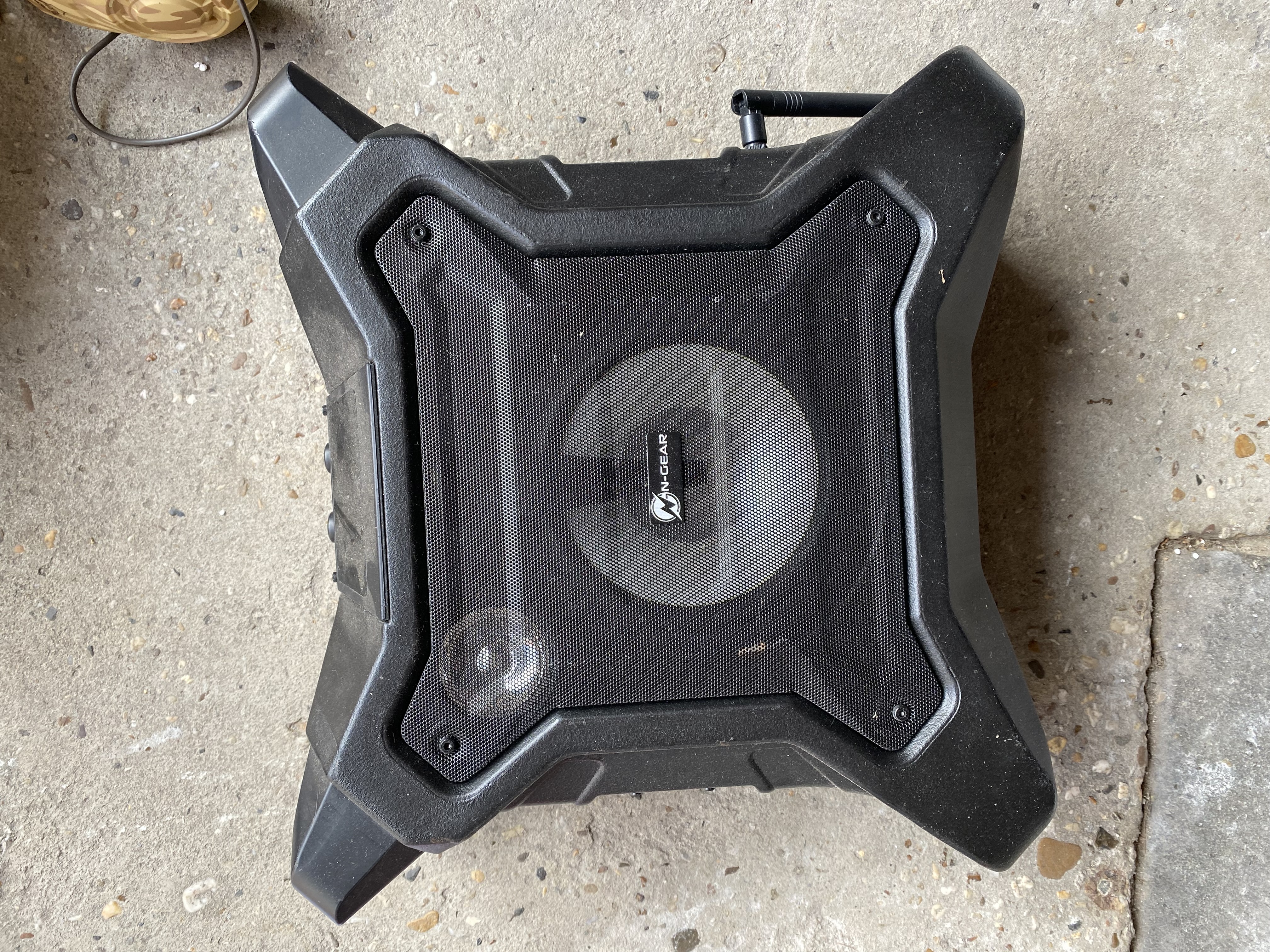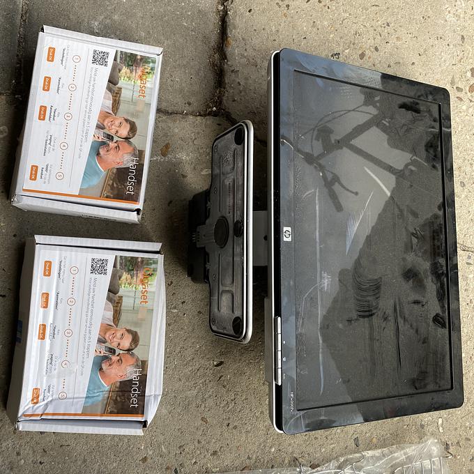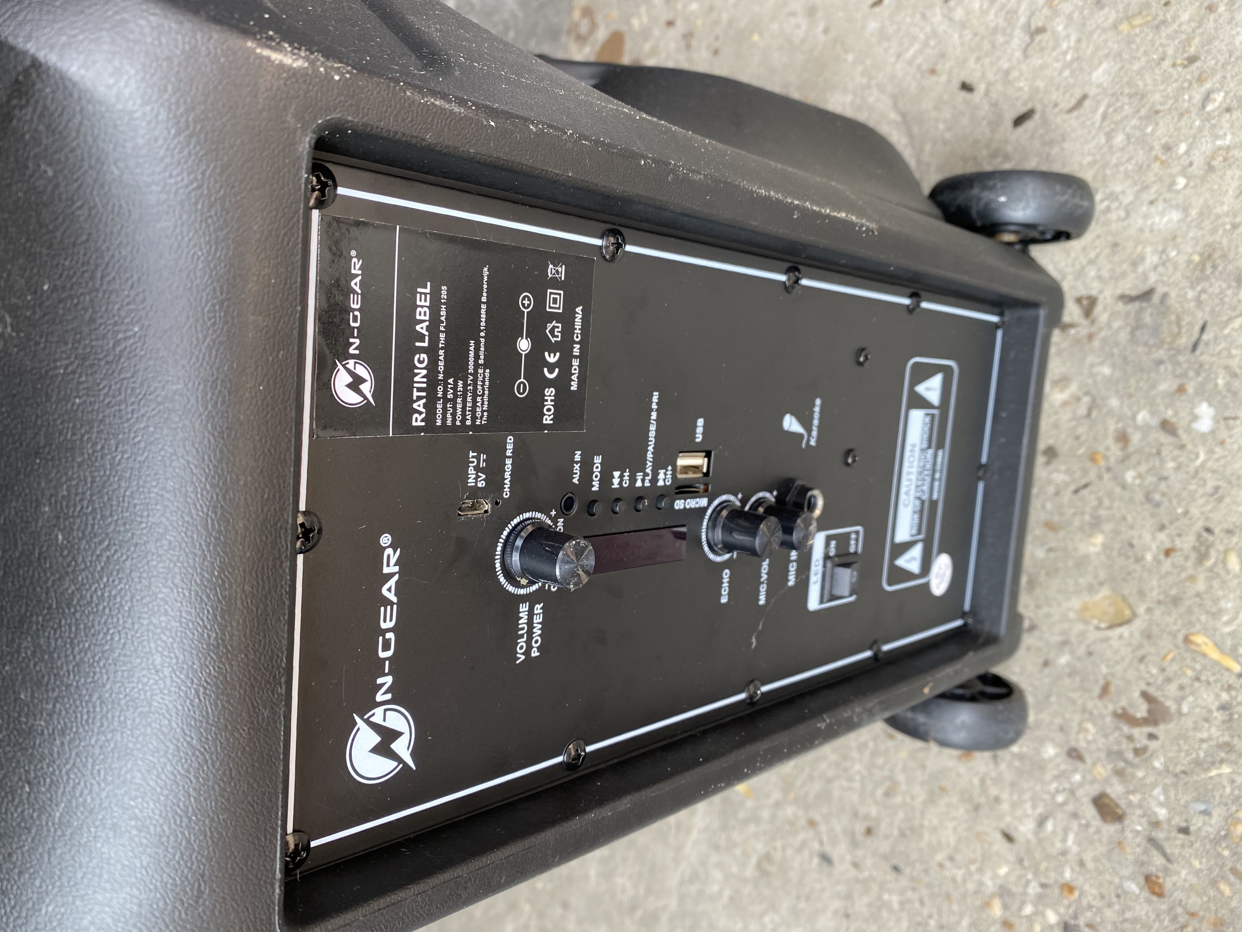 1 Rolcontainer met o.a. monitoren, stofzuiger, N-Gear speakers, zie foto's voor details