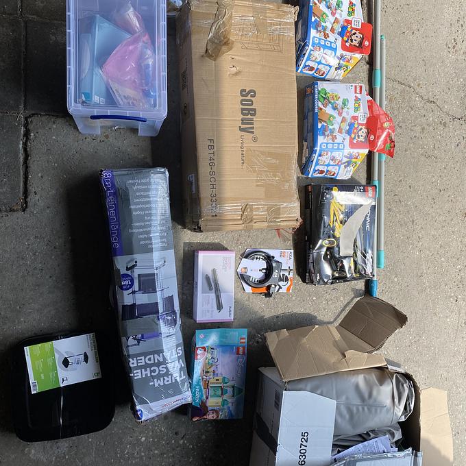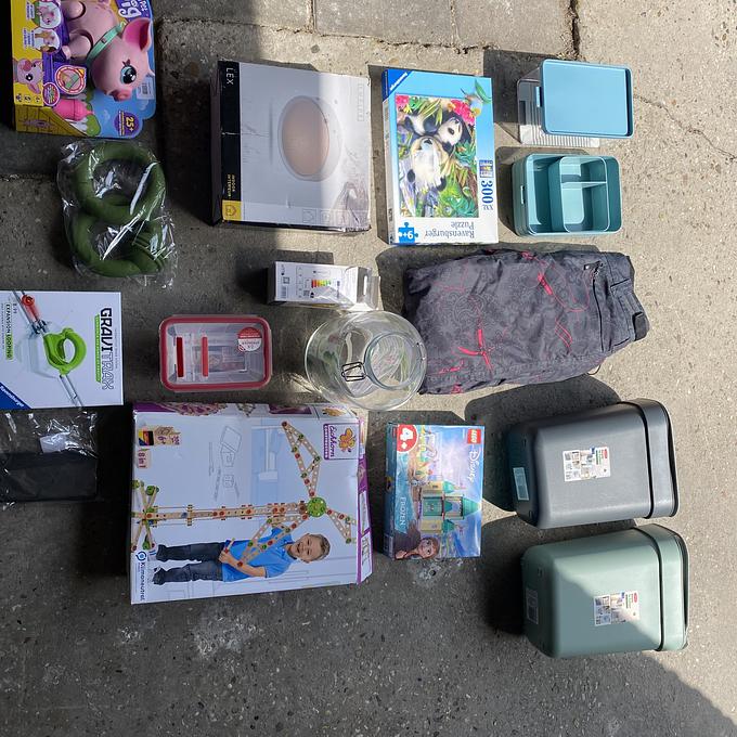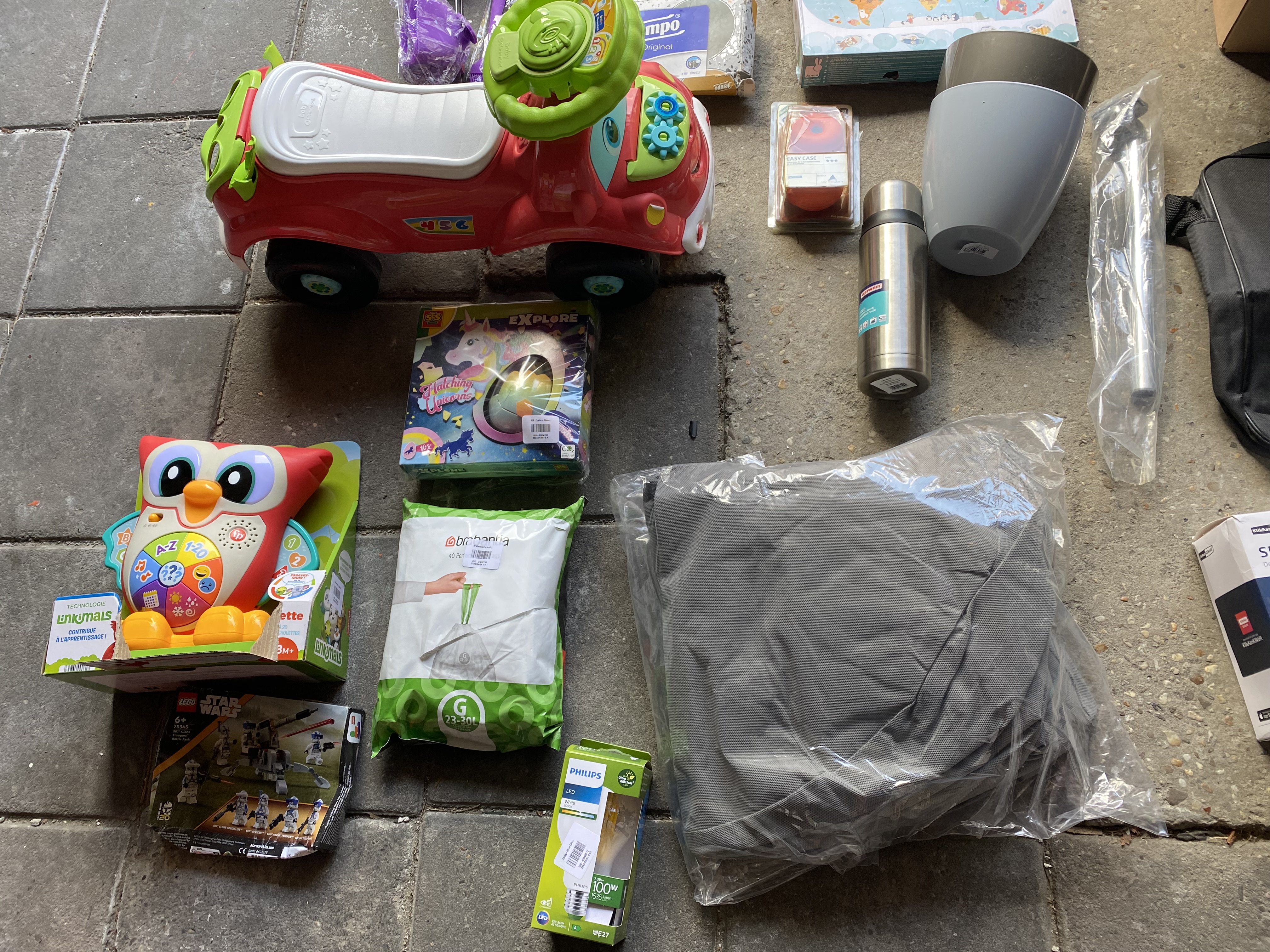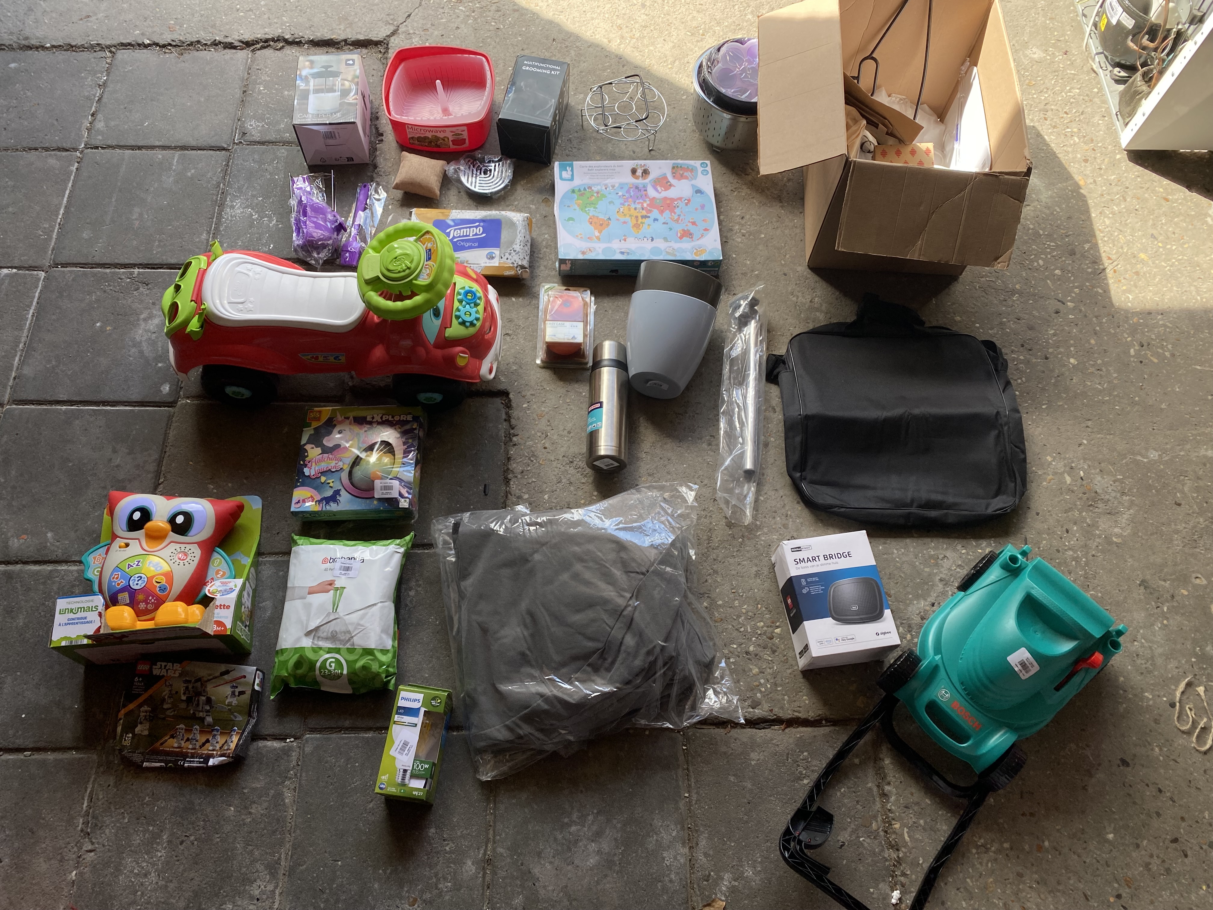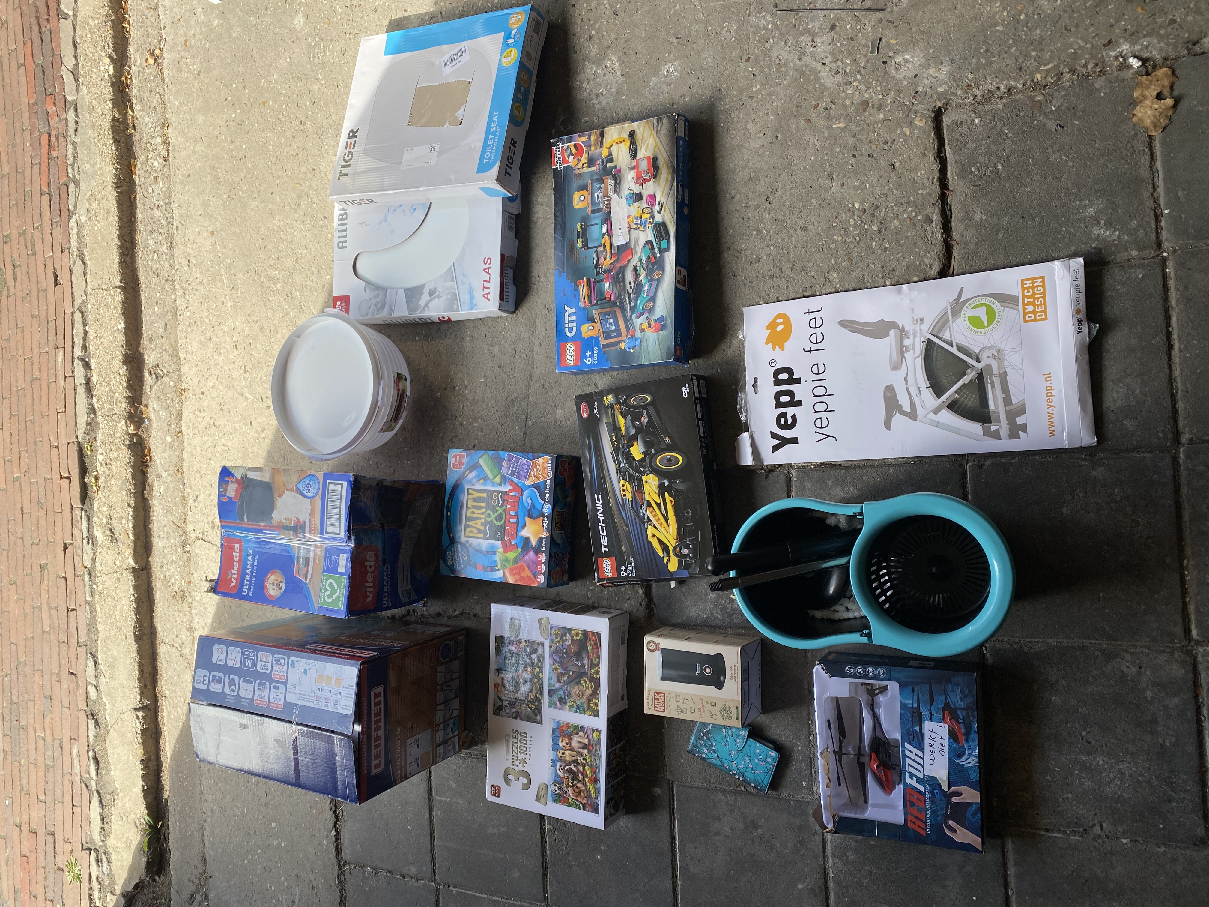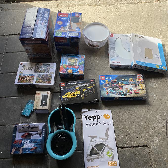 Over de 1x Rolcontainer met Lego, elektrische en huishoudelijke artikelen + 1x Pallet restartikelen