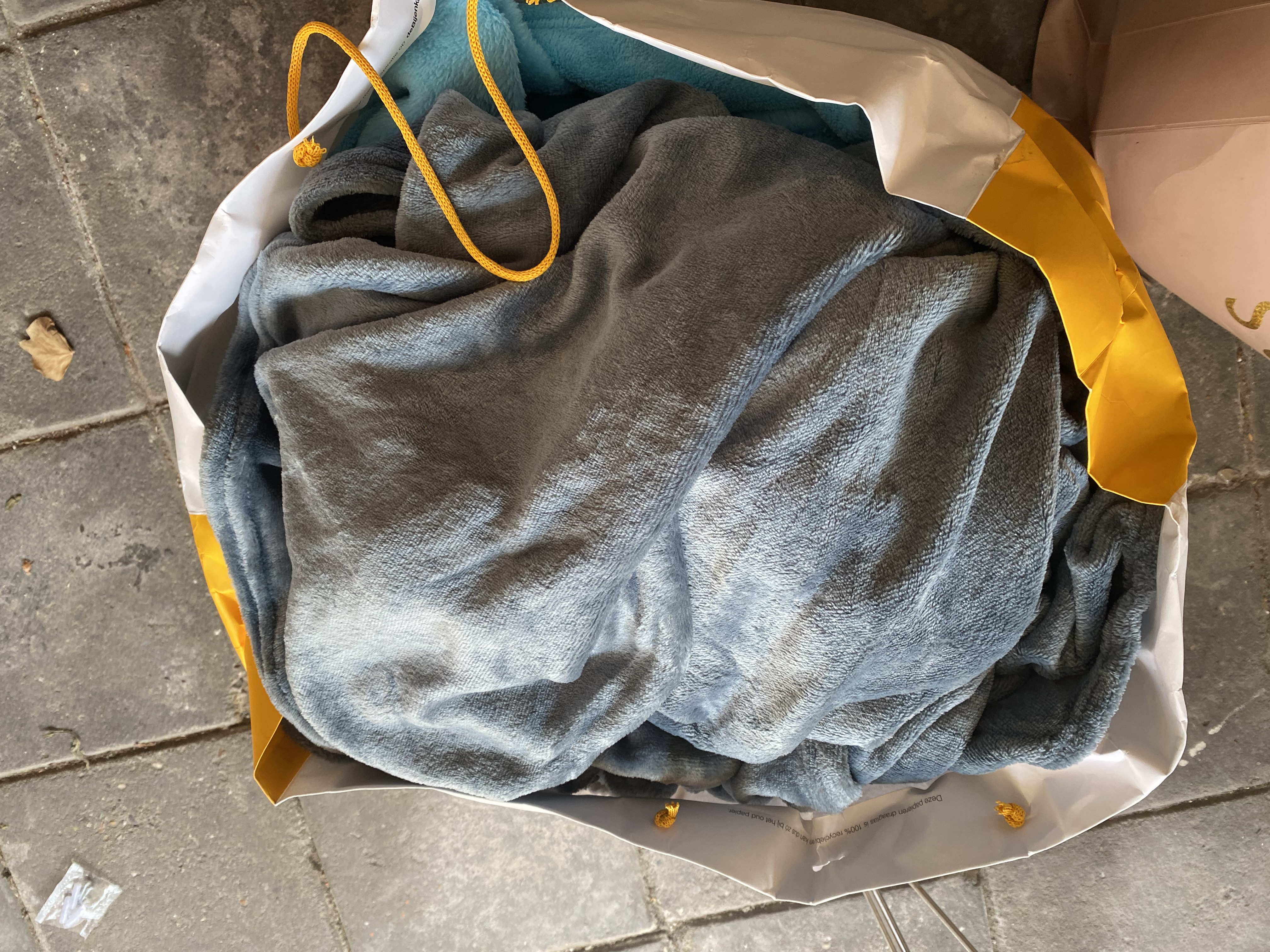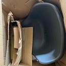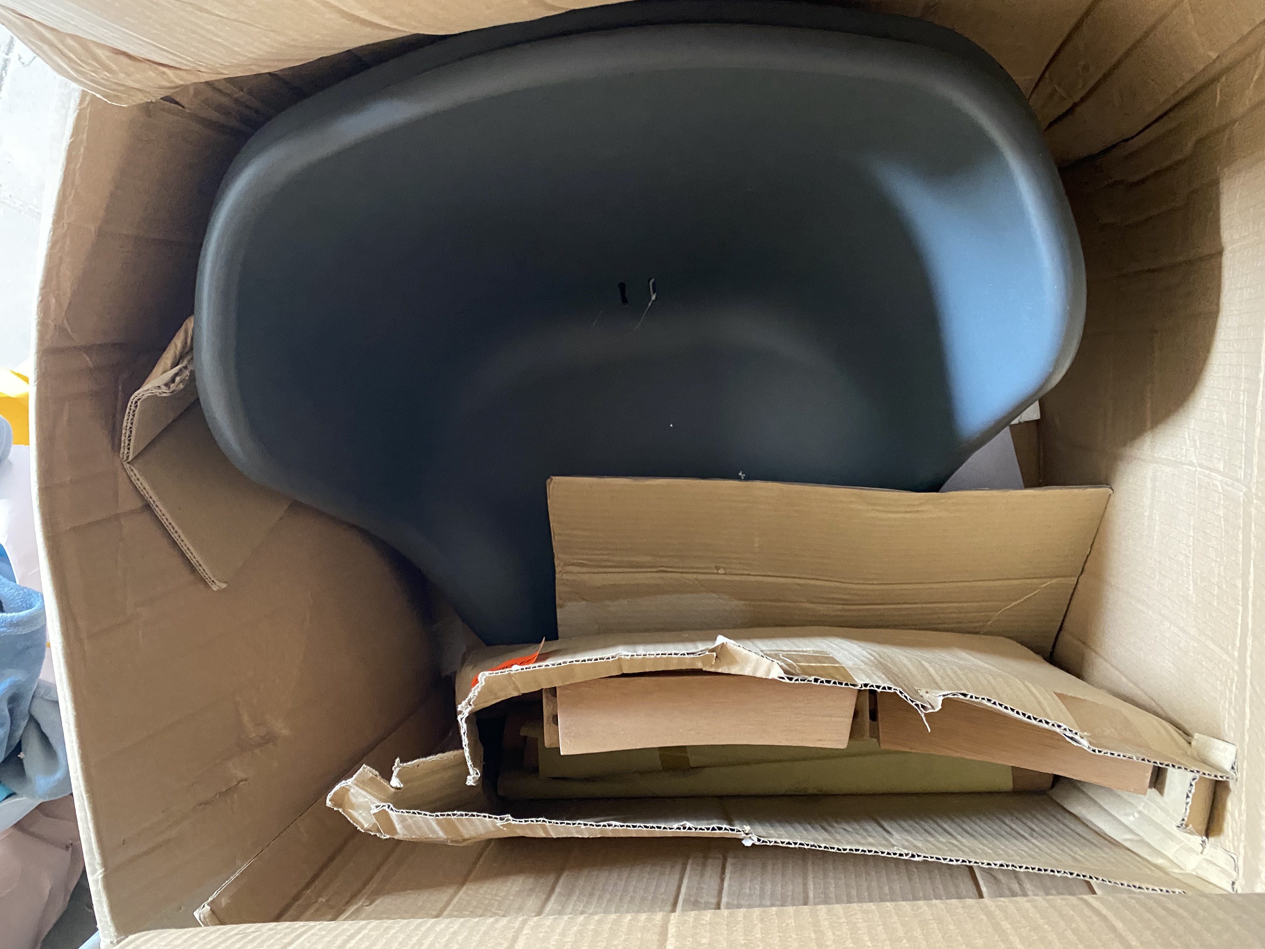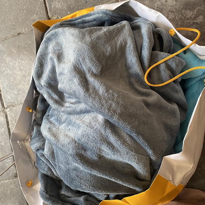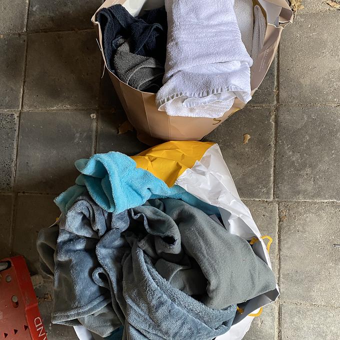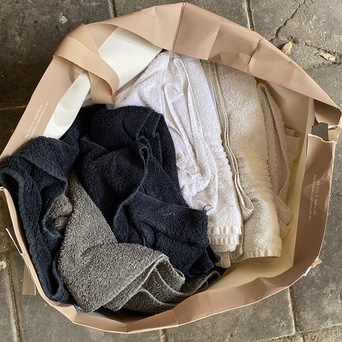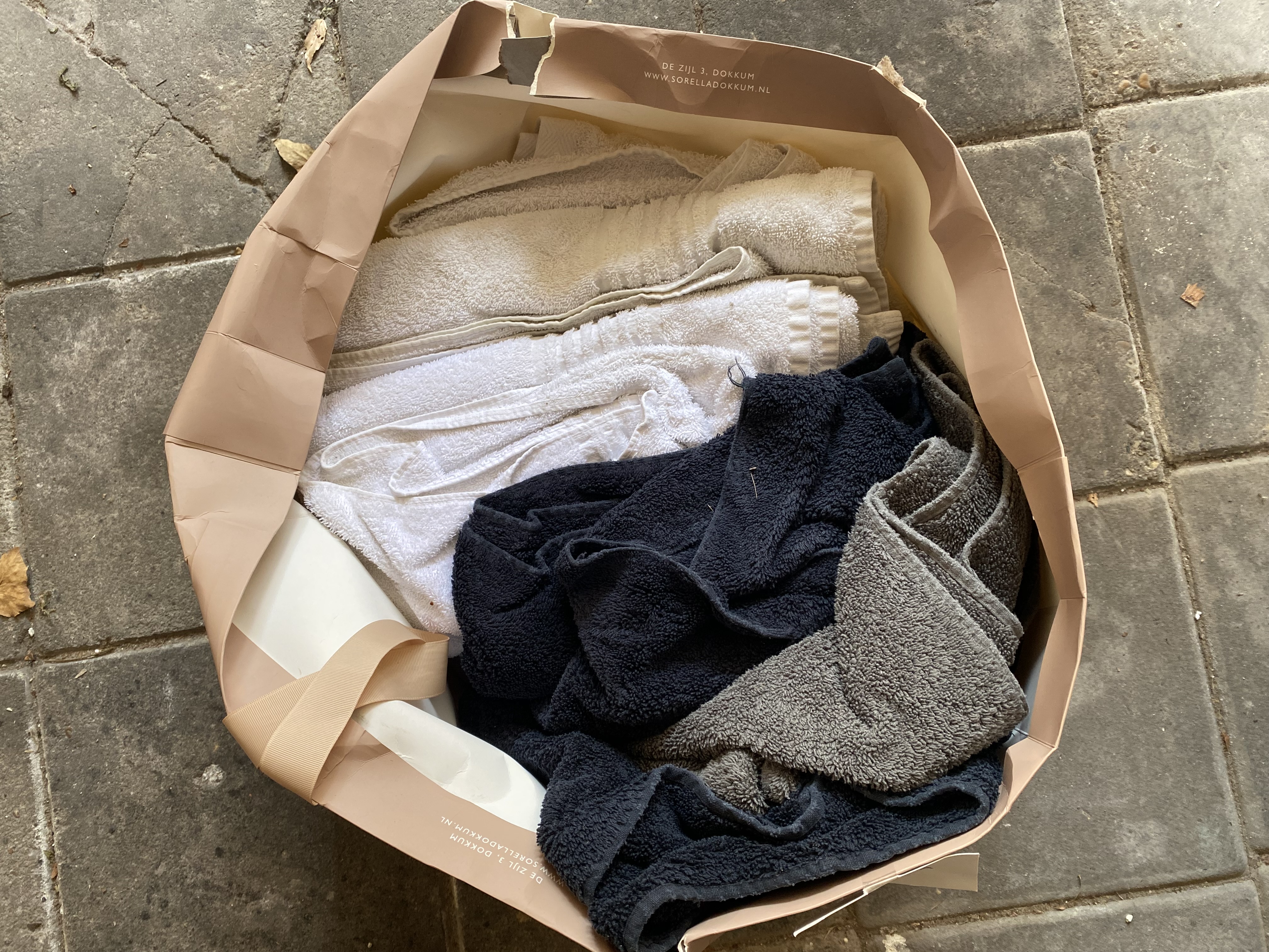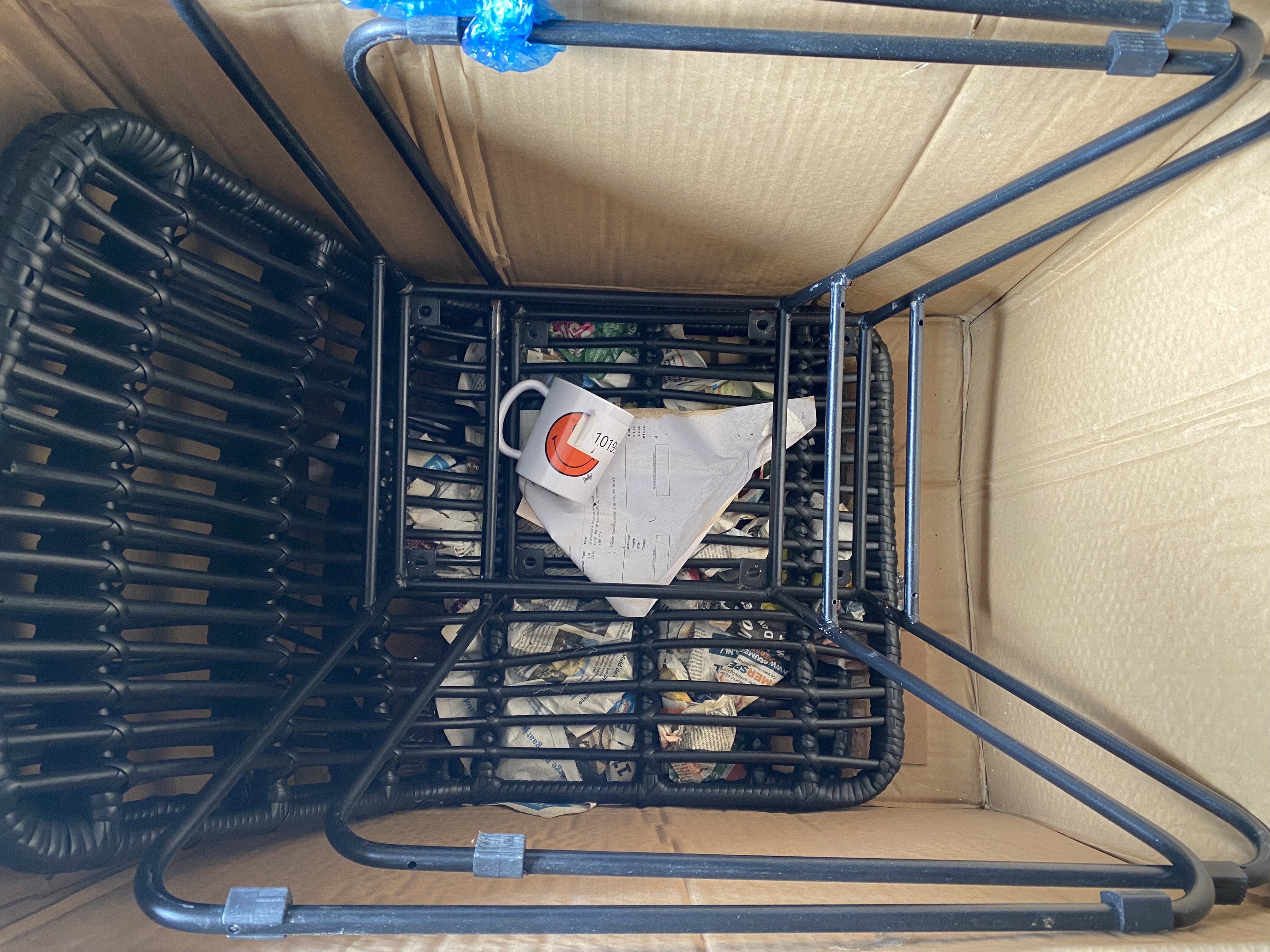 1 Rolcontainer met 1x Zweedse kuipstoel lichtgrijs, 2x Zweedse kuipstoel antraciet, 2x zwarte rieten stoel, ca. 15 Witzer badhanddoeken verschillende kleuren, ca. 5 fleecedekens grijs en blauw