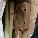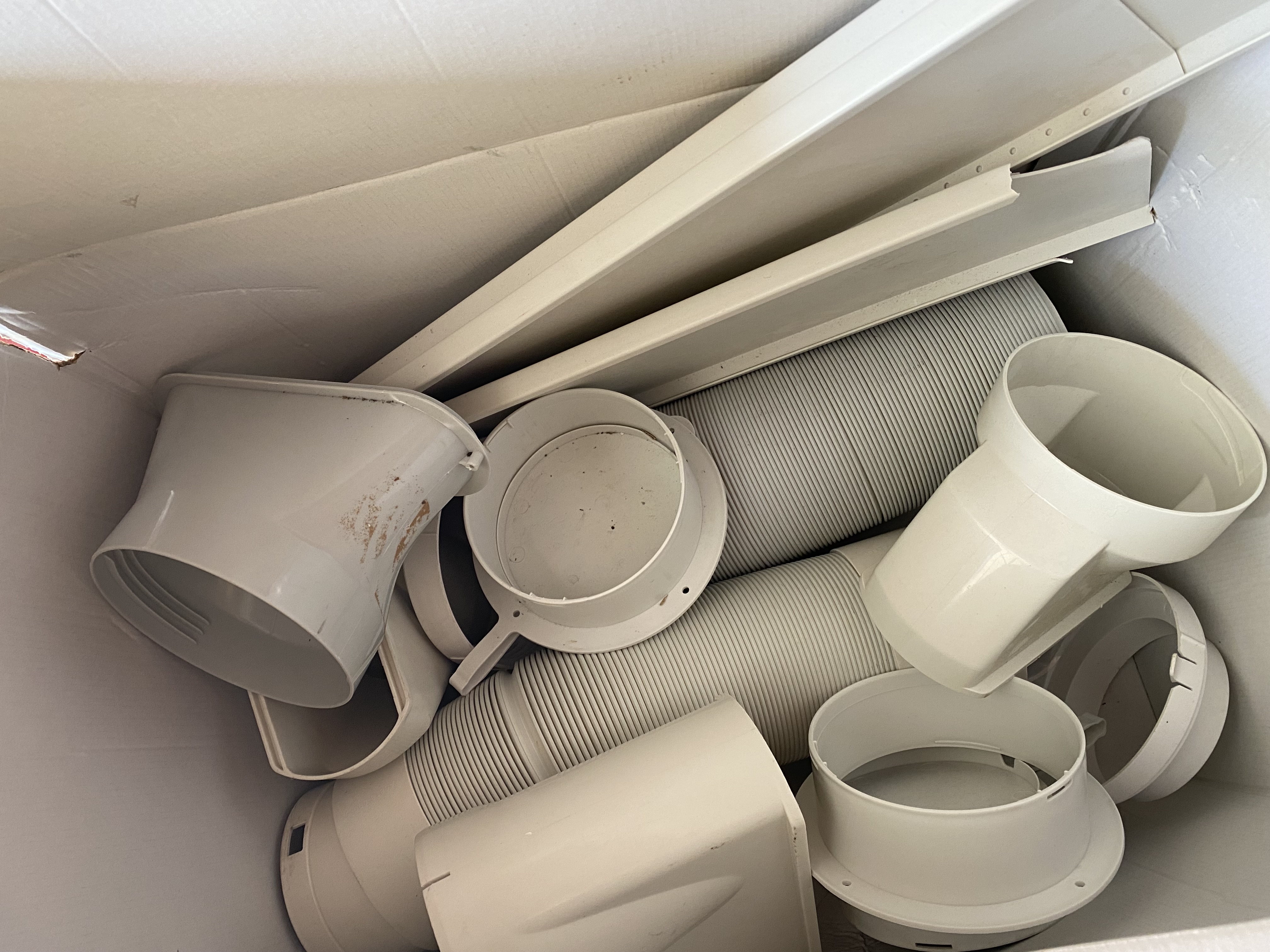 1 Rolcontainer met 2x parasolpoot 15kg, 1x camerastandaard, 1x fotodoek, 1x beamerdoek, doos met airco-onderdelen