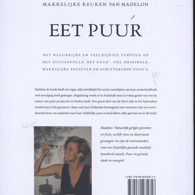 Productbeschrijving: HET NIEUWE KOKEN: PUUR, GEZOND EN TIJDLOOS. HET KLEURRIJKE EN VEELZIJDIGE VERVOLG OP HET SUCCESVOLLE KOOKBOEK 'EET PUUR'. VOL ORIGINELE, MAKKELIJKE RECEPTEN EN SCHITTERENDE FOTO'S. Madelon de Joode heeft een eigen stijl van koken ontwikkeld die na het verschijnen van haar eerste kookboek veel navolging heeft gekregen. Regelmatig werkt ze in Frankrijk waar ze volop geniet van wat de natuur aan pure producten te bieden heeft. Maar ook haar Hollandse boomgaard en moestuin zijn een voortdurende bron van inspiratie voor haar. De pure ingrediënten, samengebracht in mooie en verrassende smaakcombinaties maken dat een gerecht uit dit boek niets extra's nodig heeft. Een kookboek vol met de lekkerste recepten voor het hele gezin, voor elk moment van de dag. Makkelijk, puur en heel lekker, dáár gaat het om in dit boek! Madelon: 'Met mijn recepten tover je in een handomdraai de lekkerste gerechten op tafel voor het hele gezin. Ook als je rekening moet houden met intoleranties. Of je af wil vallen, meer energie wil krijgen of gewoon gezonder wil eten, met dit boek zit je goed!'