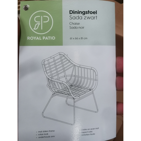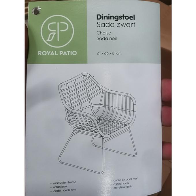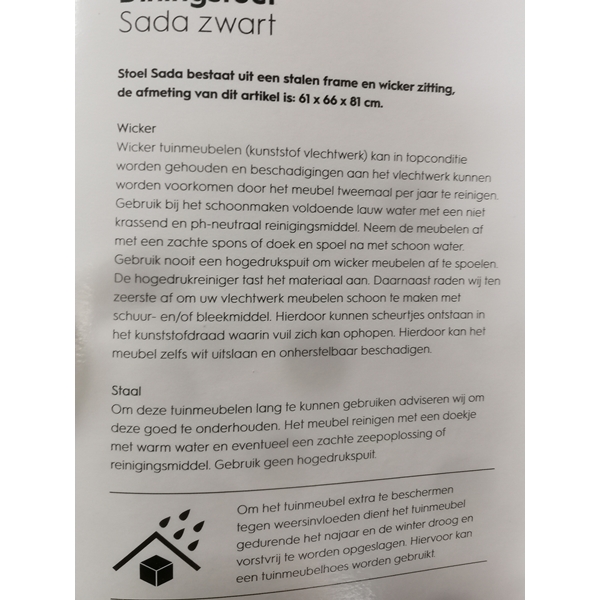 Productbeschrijving: Het design van deze Diningstoel is Sada, hij is geheel zwart met dik gevlocten wicker materiaal. De poten zijn van staal en de stoel is heel duurzaam! Kijk wel uit de stoel te beschermen tegen regen want hij kan daar niet heel goed tegen.