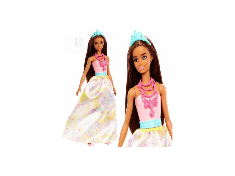 Productbeschrijving: Barbie Dreamtopia-prinsespop is klaar om het magische koninkrijk Sweetville te regeren! Ze is gekleed voor elke koninklijke gelegenheid of sprookjesavontuur in een felgekleurde outfit met een verwijderbare rok, mooie tiara en bijpassende schoenen. Barbie-pop is geïnspireerd op het land van Sweetville en dat geldt ook voor haar snoepkleurige look. Een print van hartjes en snoepjes siert de lange rok; snoepjes sieren haar lichtroze lijfje met een ketting en een riemeffect. Een blauwe tiara en een paar lichtroze schoenen maken de look af met koninklijke charme.