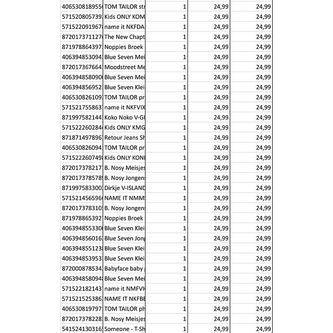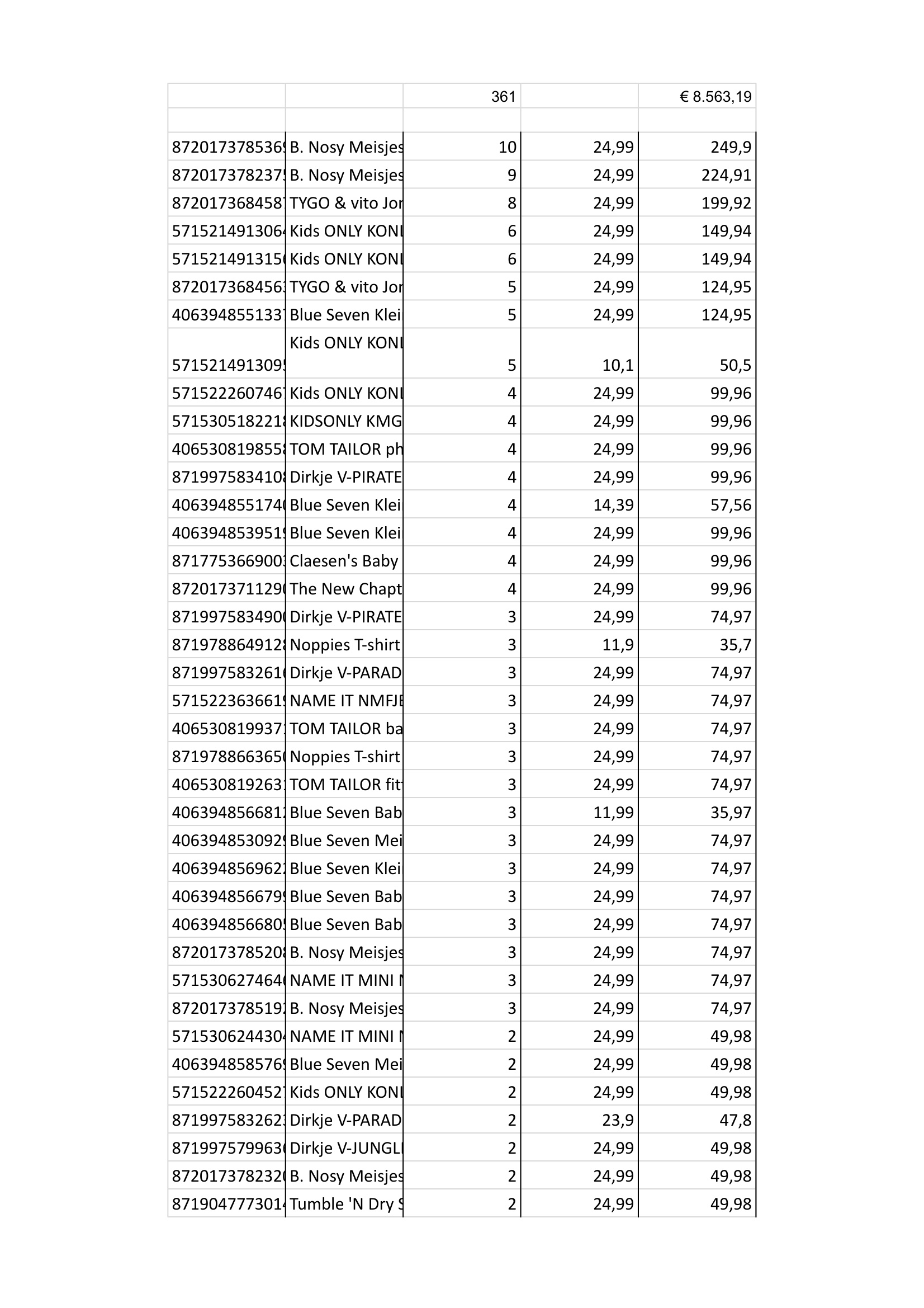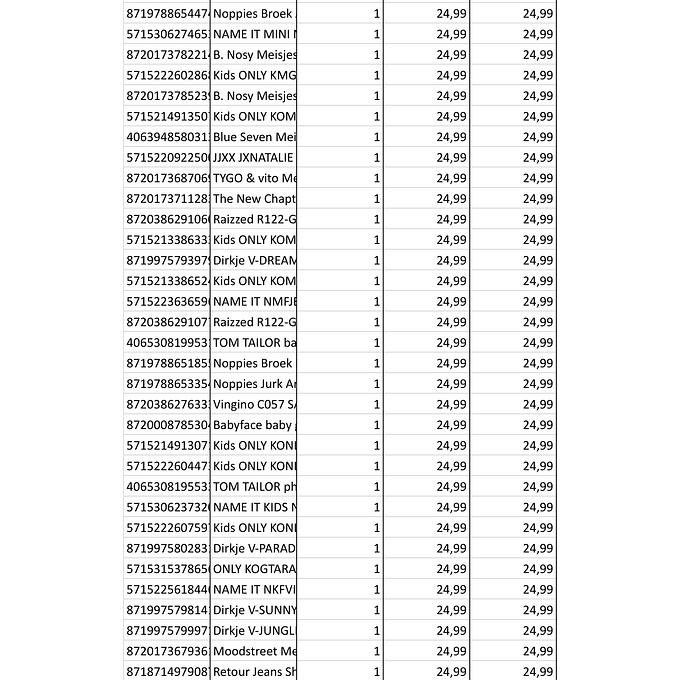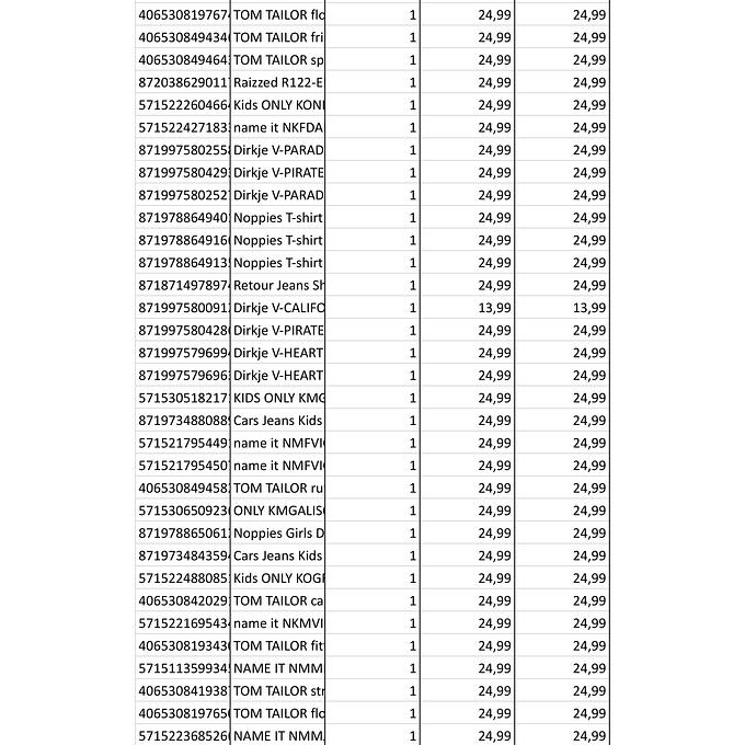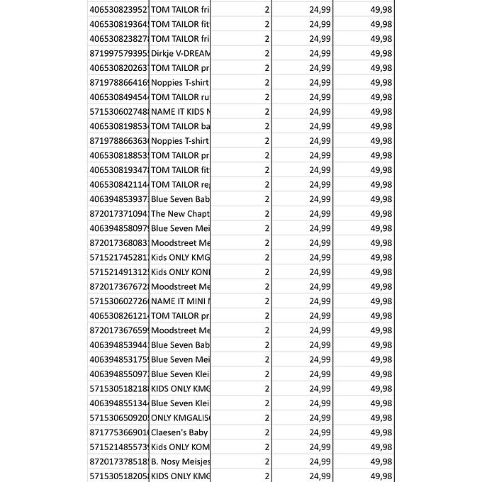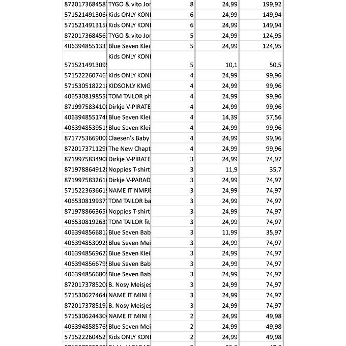 Productbeschrijving: Partij van 361 stuks kinderkleding van diverse merken maten, o.a: (B. Nosy, Name IT, Noppies, Moodstreet, Babyface etc. Bij de afbeeldingen staat de volledige lijst met artikelen van deze partij. De partij bestaat volledig uit nieuwe artikelen