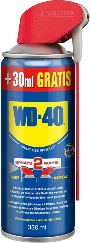Productbeschrijving: De multifunctionele WD-40 beschermt het metaal tegen roest en corrosie, voegt in de vastzittende delen en verwijdert Squeaks, stoot vocht af en smeert bijna alles. Het verwijdert zelfs vet, vuil en meer van de meeste oppervlakken.