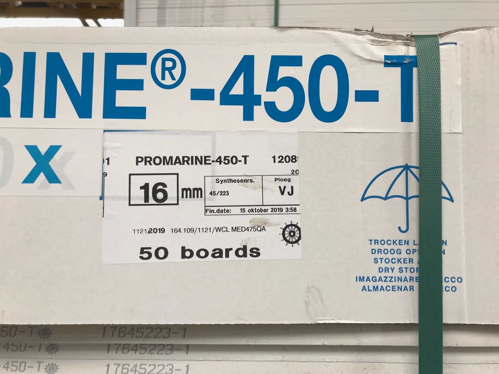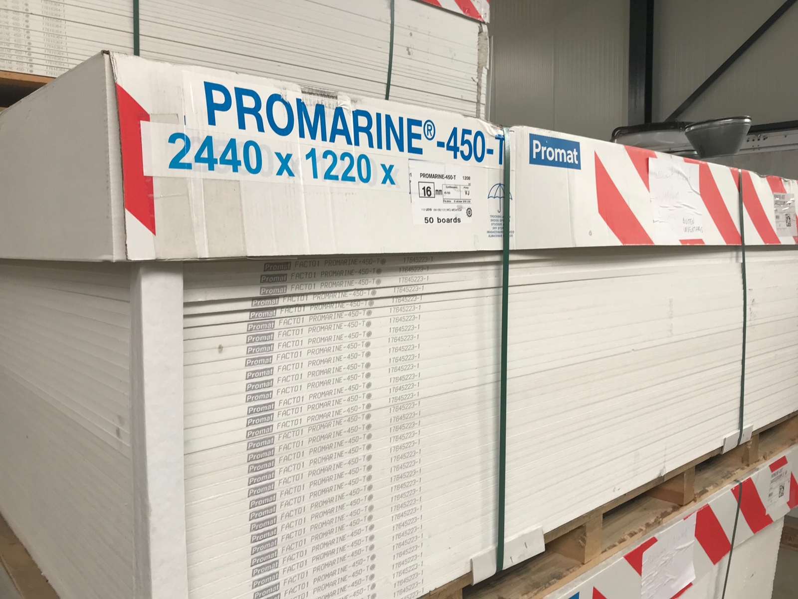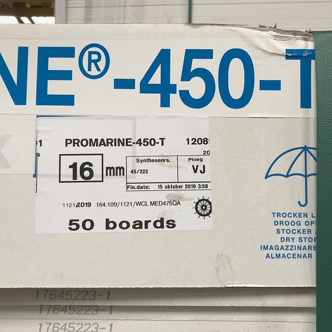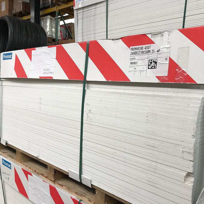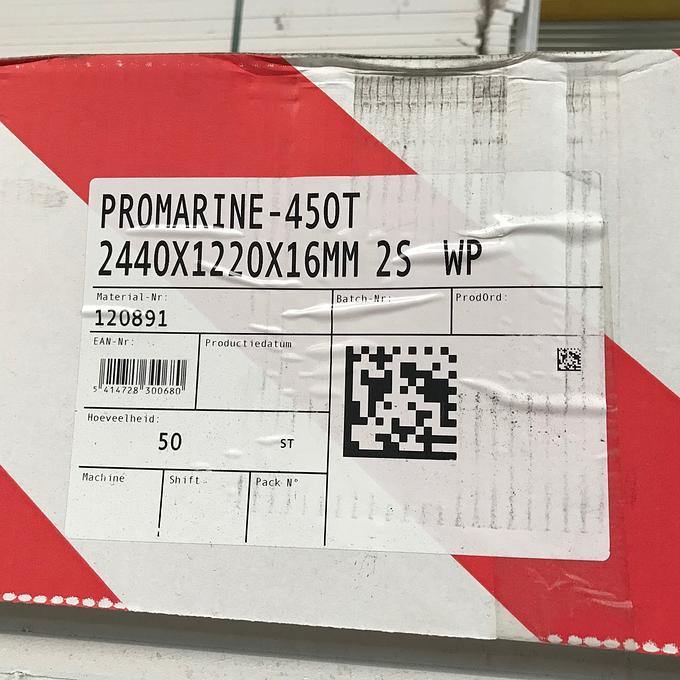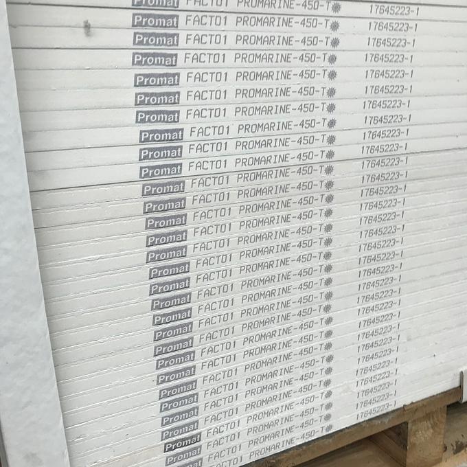 Productbeschrijving: Promarine 450 wordt gebruikt als brandwerende wandpanelen, plafondpanelen en vloerpanelen in verschillende ruimtes. Het verschil tussen de twee varianten is dat de 450 variant een stuk lichter is dan de 640. Om precies te zijn 450kg/m³ ten opzichte van 640kg/m³. Vooral voor bij het gebruik als plafondpanelen is dat een welkom voordeel. Promarine 450 wordt gemaakt van calciumsilicaat, verrijkt met mineralen en vezels. Voldoet volledig aan de eisen van Marine Equipment Directive 96/98/EC (volgens Directive 98/95 en Directive 2001/53). Een Promarine paneel is sterk en robuust en is eenvoudig in gebruik en kan makkelijk verwerkt worden met standaard gereedschap voor houtbewerking.