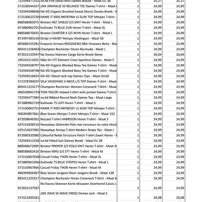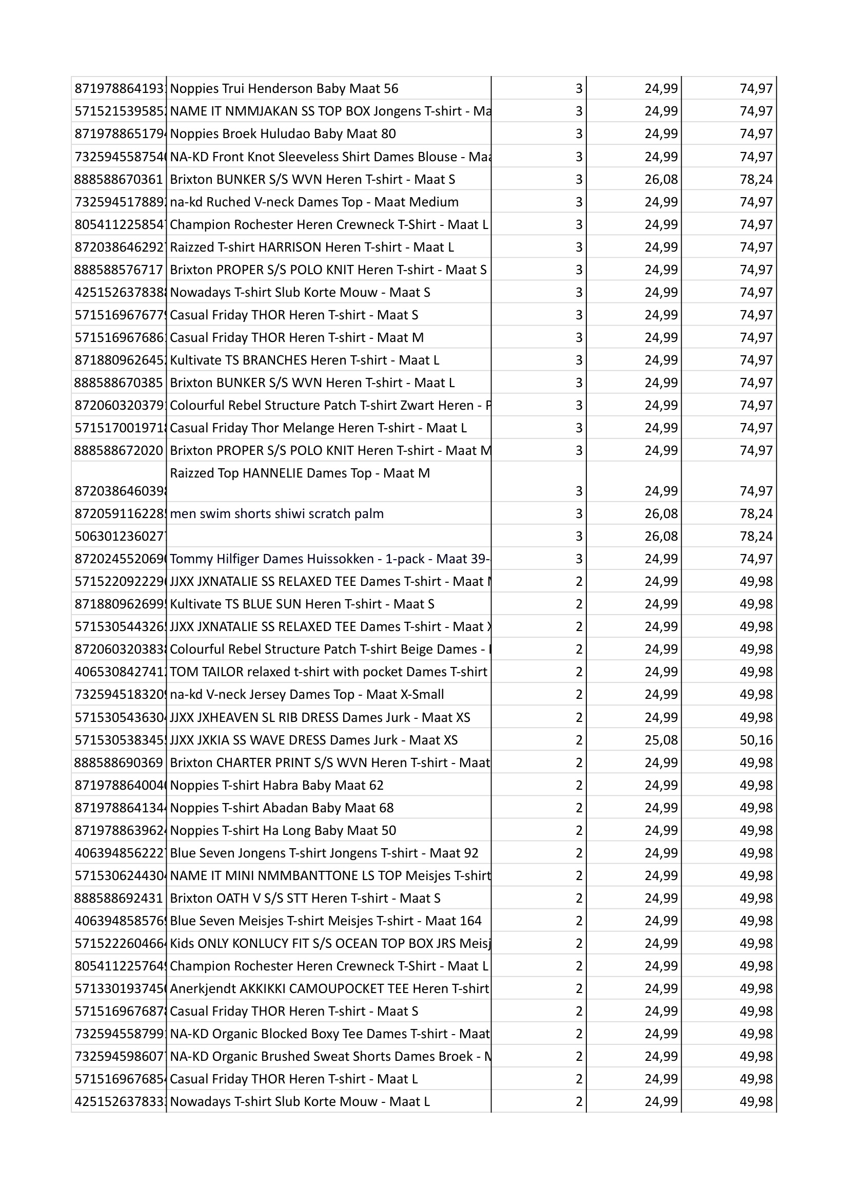 Productbeschrijving: Partij van 500 stuks dames- heren en kindermode. Onder andere van de merken: NA-KD, Tom Tailor, Jack&Jones, Ichi, Babyface, Raizzed etc. Voor de volledige lijsten van de producten, zie afbeeldingen. De producten zijn volledig nieuws.