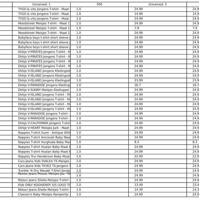 Productbeschrijving: Partij van 500 stuks kinderkleding van diverse merken, maten en modellen. Merken die onder andrere in de partij zitten: Vingino, Dirkje, NAME IT, B. Nosy, Moodstreet, Retour Jeans, Blue Seven, Raizzed, Noppies, Babyface etc. Bij de foto's zijn de lijsten met de producten, adviesprijzen en omschrijvingen opgenomen. De volledige partij bestaat uit nieuwe items