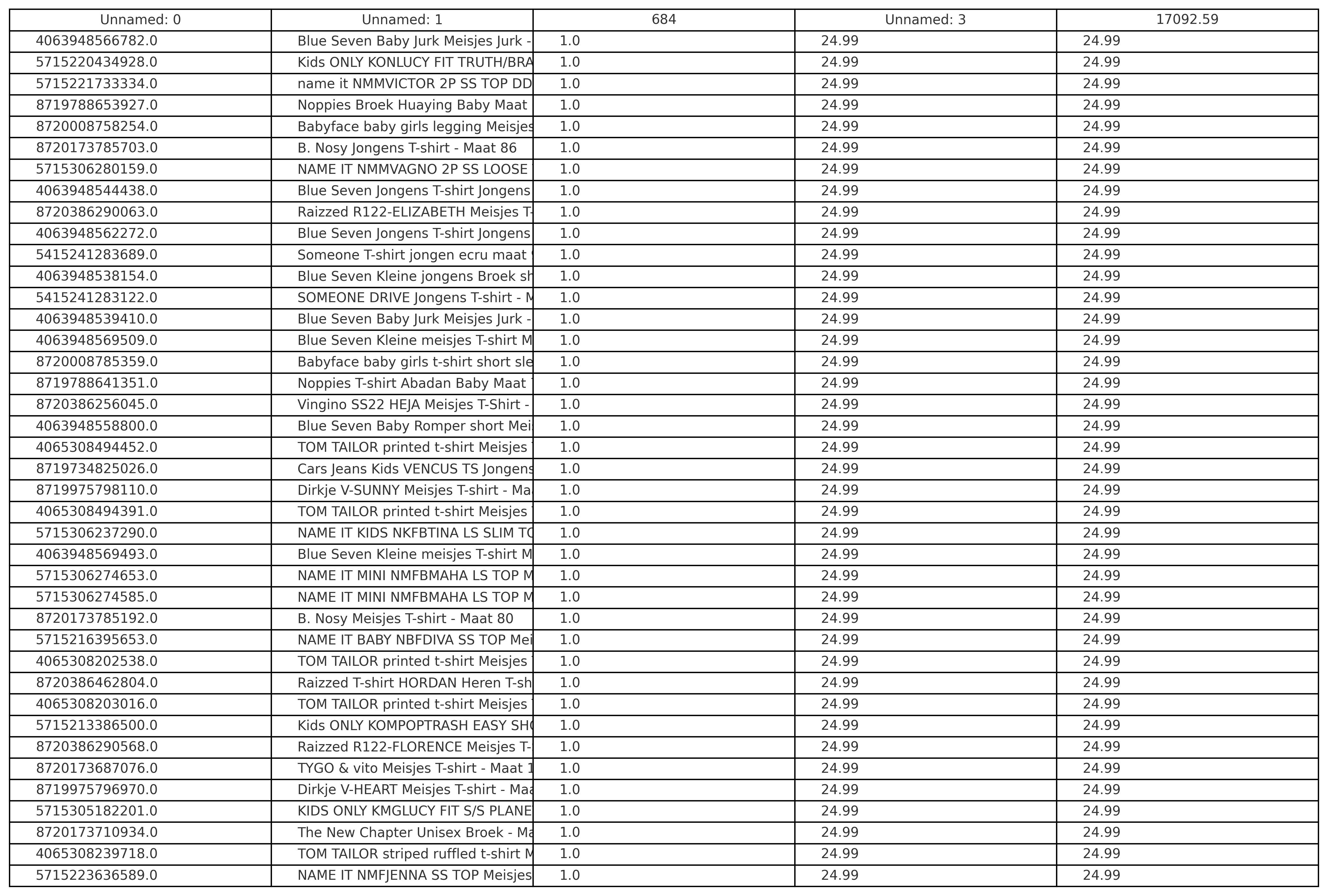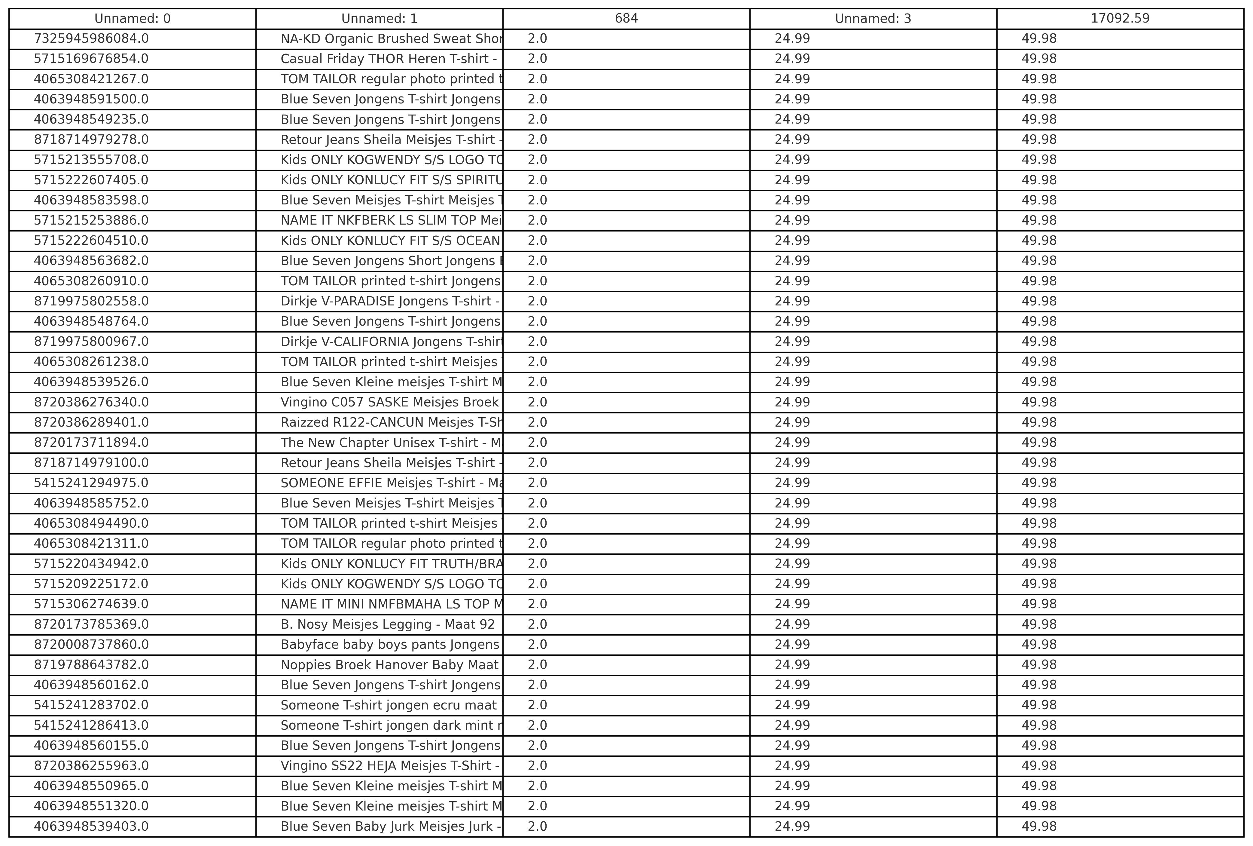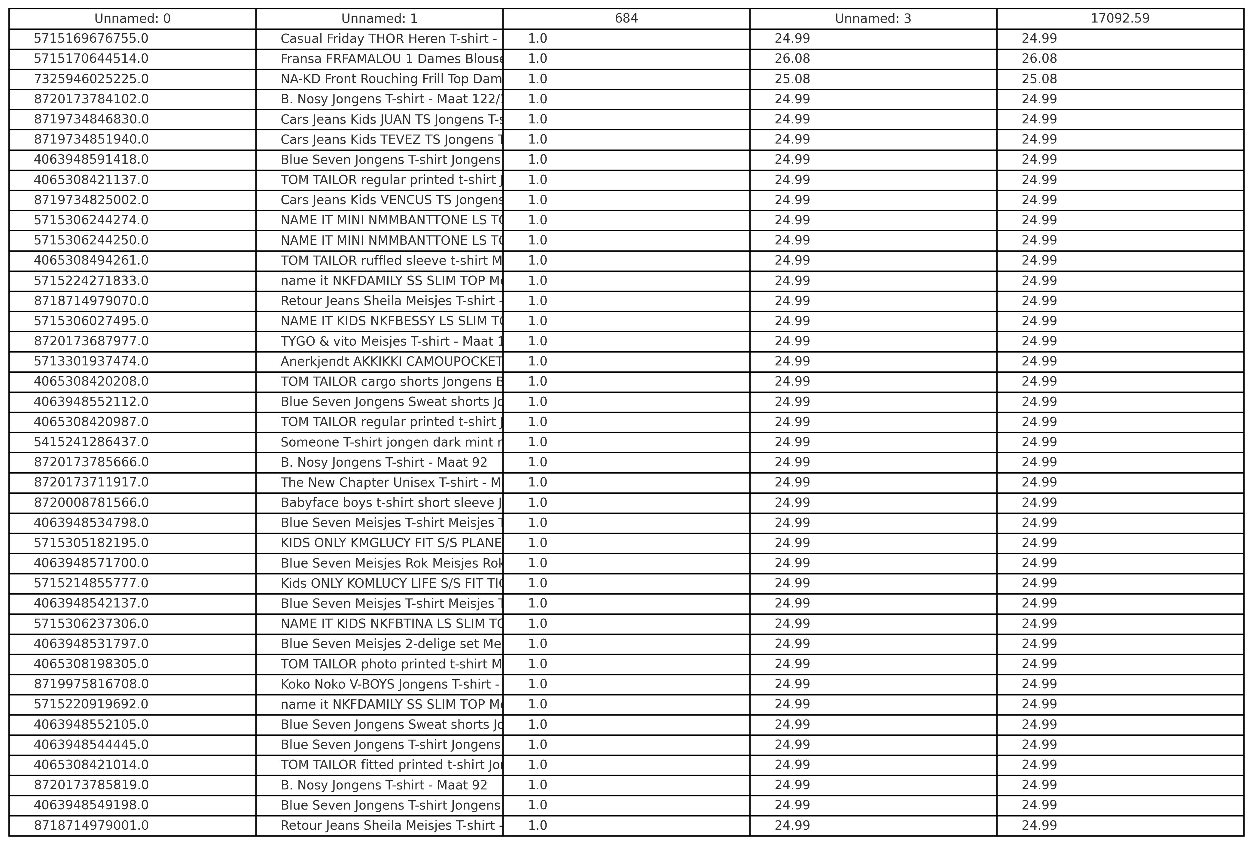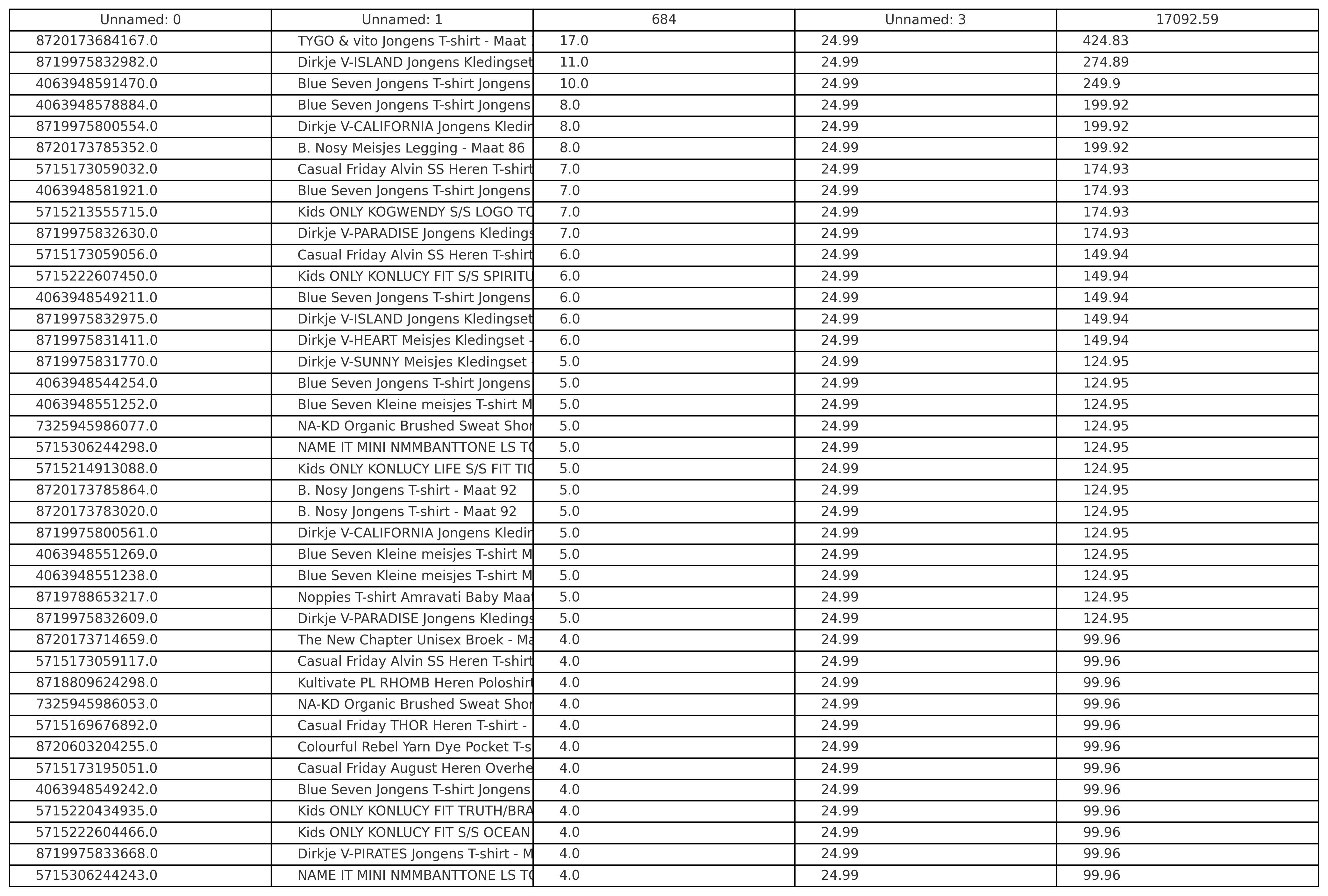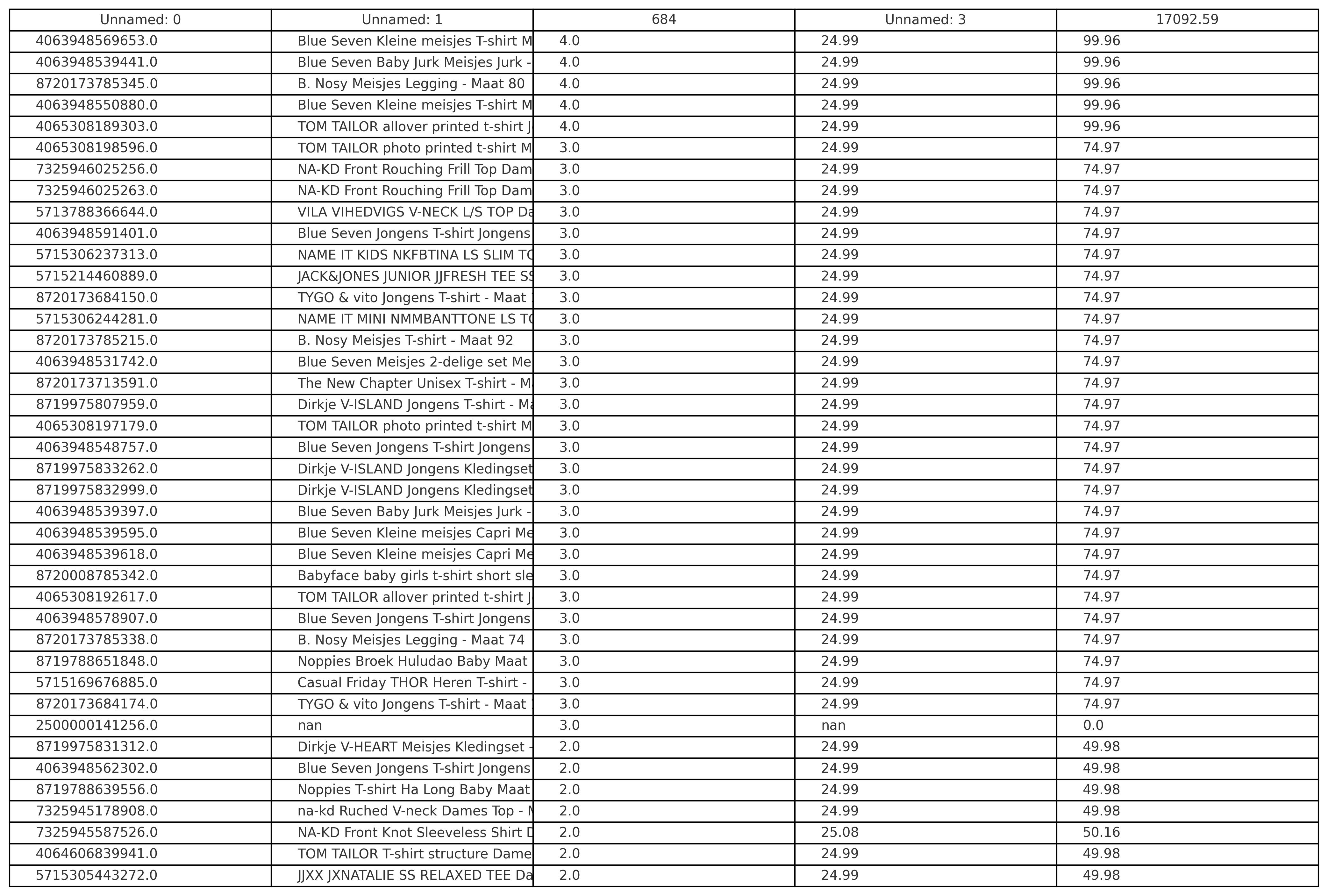 Productbeschrijving: Partij van 500 stuks kinder-, dames- en herenmode van diverse merken, maten en modellen. Merken die onder andrere in de partij zitten: Blue Seven,, Babyface, Vingino, Tom Tailor, Under Armour, Jack&Jones, NA-KD etc.. Bij de foto's zijn de lijsten met de producten, adviesprijzen en omschrijvingen opgenomen. De volledige partij bestaat uit nieuwe items