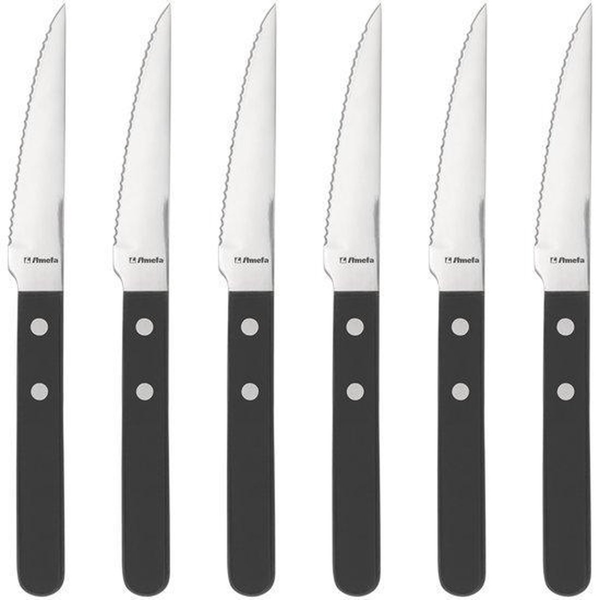 Productbeschrijving: enieten van elk eetmoment doe je met Amefa bestek! Amefa biedt u een breed scala aan bestek modellen en bijbehorende producten zodat u bij elke gelegenheid de juiste sfeer kunt creëren. Of het nu gaat om een ontbijt met uw familie, een diner met uw vrienden of om een feestelijke barbecue, Amefa heeft een design voor elke gelegenheid of stijl en maakt het alledaags genieten van lekker eten nog aantrekkelijker. De traditioneel gevormde steak/pizzamessen hebben een geklonken greep en een gekartelde lemmet. De messen liggen fijn in de hand en door de gekartelde lemmet wordt snijden een makkelijke opgave. De tijdloze vormgeving in combinatie met het duurzame ontwerp zorgt er voor dat u jaren lang plezier heeft van uw steakmessen.