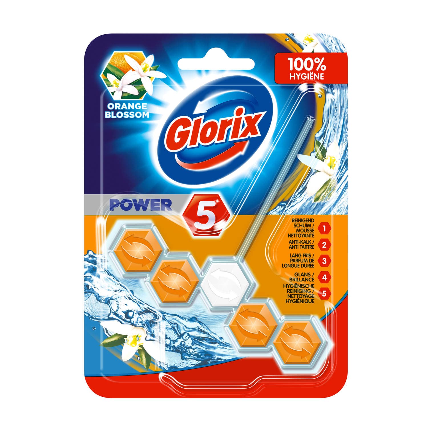 Productbeschrijving: Met Glorix je hele toilet écht schoon! Het Glorix WC blok Fresh Orange Blossem geeft elke spoelbeurt de kracht van nieuwe Glorix Power 5. 1. Reinigend schuim 2. Anti-Kalk 3. Lang fris 4. Glans 5. Hygiënische reiniging