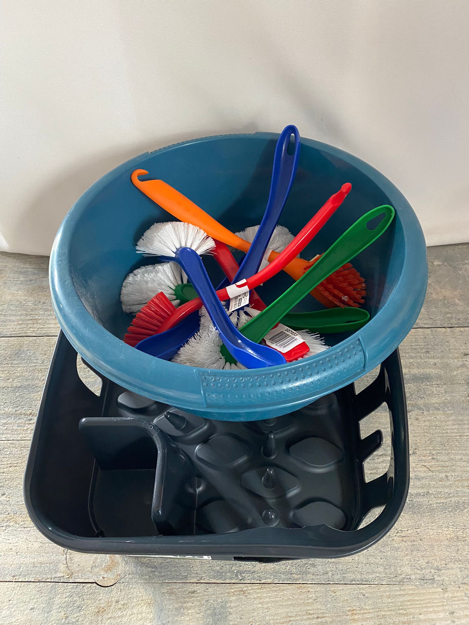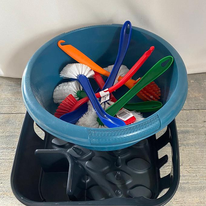 Afwaskavel met afwastob, afwasrek en afwasborstels