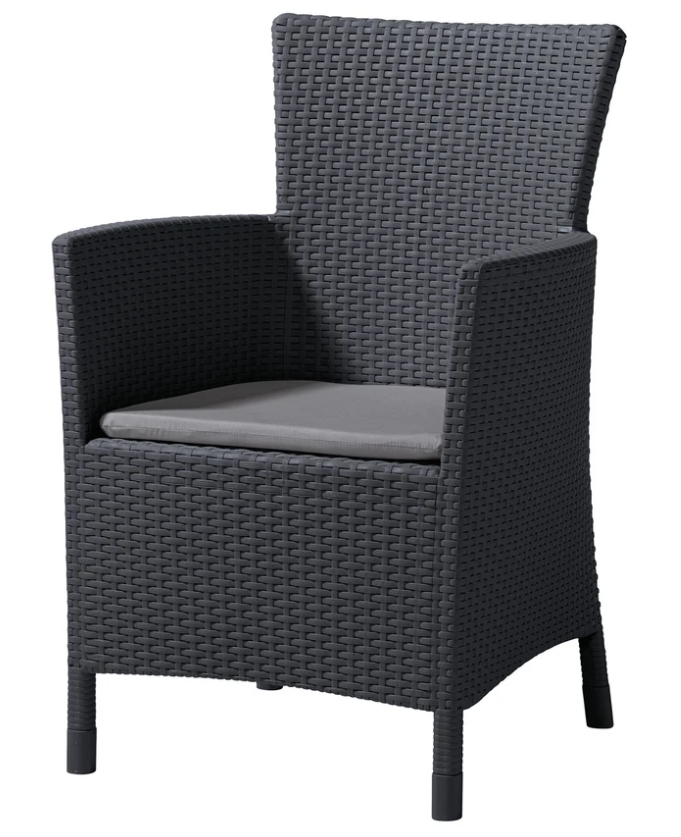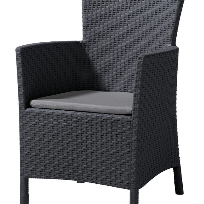 Productbeschrijving: De Iowa tuinstoel heeft een prachtig wicker design. De moderne grafiet kleur is makkelijk te combineren met de tuintafels van Allibert. Van romantisch tot modern, elke tuintafel heeft zijn eigen charme. De Iowa tuinstoel voelt zich overal goed bij en daar word jij blij van. Op welk moment van de dag je ook een beroep doet op de Iowa, je zit er altijd goed bij. Comfortabel in de rug en onmisbare ondersteuning voor je armen. Het mooie, zachte kussen wordt meegeleverd. De Iowa kan goed tegen regen, zon en kou, dus je kunt hem met een gerust hart buiten laten staan.