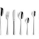 Voorzien van: 6 tafelmessen, 6 steakmessen, 6 tafelvorken, 6 tafellepels, 10 koffielepels, 6 latte/sorbet lepels en 2 opscheplepels.