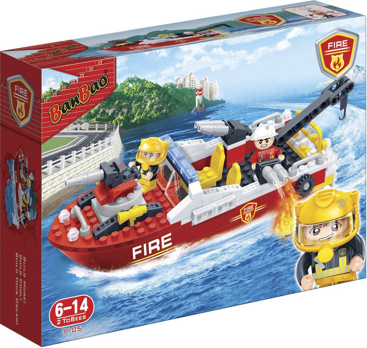 Productbeschrijving: Er is een grote brand uitgebroken op een schip in de buurt van de haven van de stad. De brandweerboot scheert over de golven op weg naar de brand. De brandweermannen kunnen de vlammen gelukkig snel blussen en is het schip met alle passagiers gered. Met de trekhaak kun je het schip naar de haven brengen en de passagiers naar het vasteland brengen. Wat is deze brandweerboot toch handig in zulke situaties! Bouw de brandweerboot uit de brandweer serie met de bouwstenen van BanBao en ervaar urenlang plezier! Deze speelset bestaat uit 2 figuren, een brandweerboot en diverse accessoires.