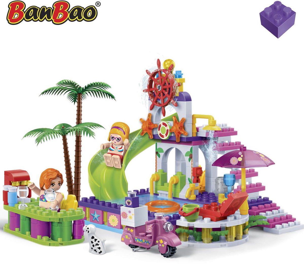 Productbeschrijving: Kom naar het zwembad op het strand om lekker te ontspannen met uitzicht op de zee. Het water is hier lekker warm en niet zout, dat is fijn! Bij de cocktailbar op de rand van het zwembad kun je heerlijke koude drankjes nuttigen. Kijk hoe groot de palmbomen zijn! Die zorgen voor een beetje schaduw als je het te warm hebt. Bouw dit zwembad aan het strand uit de Trendy Beach serie met de bouwstenen van BanBao! De Trendy Beach serie is een kleurrijke educatieve bouwserie voor meiden. Deze speelset bestaat uit een zwembad, een bar en nog veel meer.