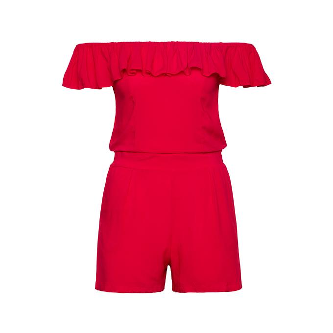 Productbeschrijving: Beachlife off-shoulder playsuit met ruffles in kleur Lollipop. De ruffles lopen over de bovenkant door als mouwtjes. De playsuit is verkrijgbaar in maat S t/m XL. De playsuit heeft een onzichtbare ritssluiting aan de zijkant en steekzakken.