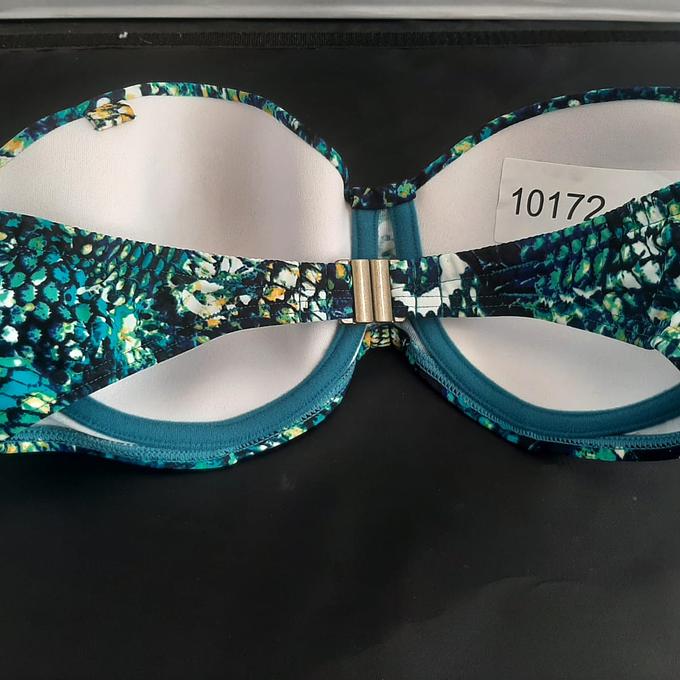 Productbeschrijving: Beachlife Bikini strapless in maat 38D. De bikini heeft een bijzondere blauw/groene print en is voledig strapless.