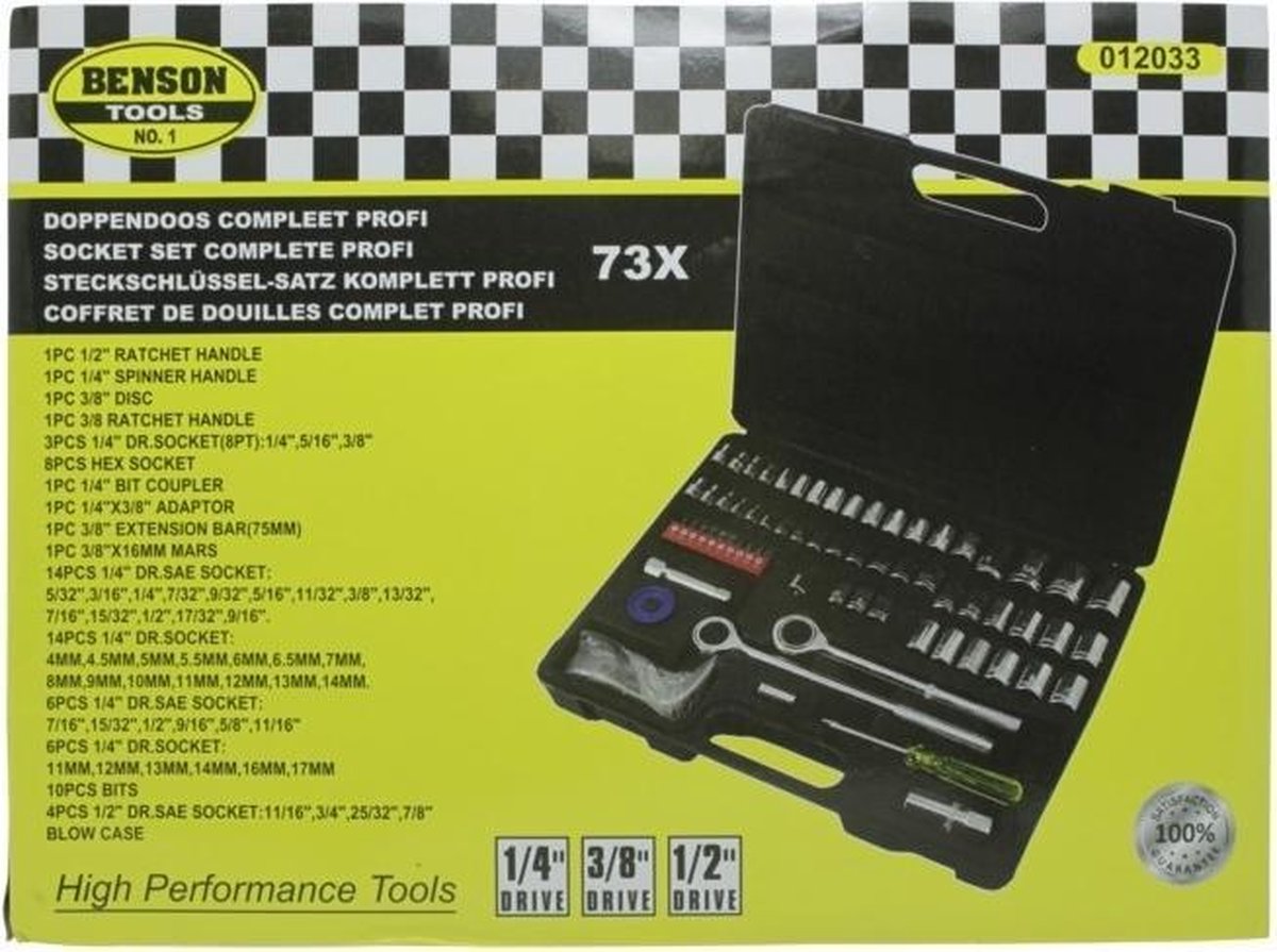 Productbeschrijving: Met deze zeer complete dopsleutelset van Benson heeft u altijd alle doppen bij de hand. De doppen worden geleverd in een solide koffer. De doppendoos is voor allerlei werkzaamheden te gebruiken, denk aan het sleutelen aan uw fiets of motorfiets. De dopsleutelset is gevuld met kwaliteitsgereedschap. Betrouwbaar gereedschap voor een degelijke prijs!