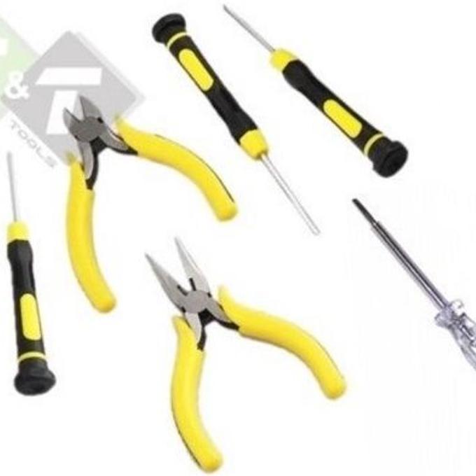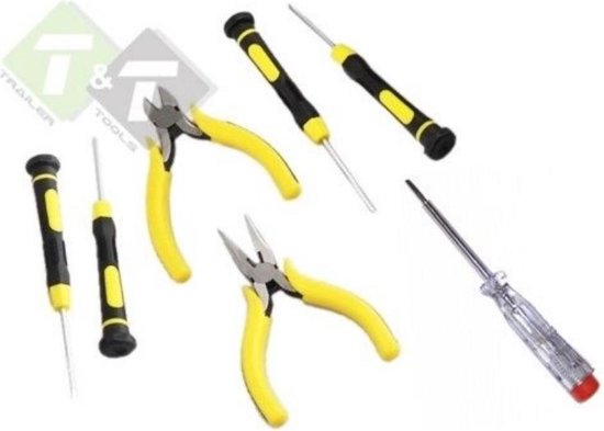 Bestaande uit: 1 x punttang 1 x kniptang 2 x precisieschroevendraaiers platte kop 2 x precisieschroevendraaiers kruis kop 1 x speciale pincet.