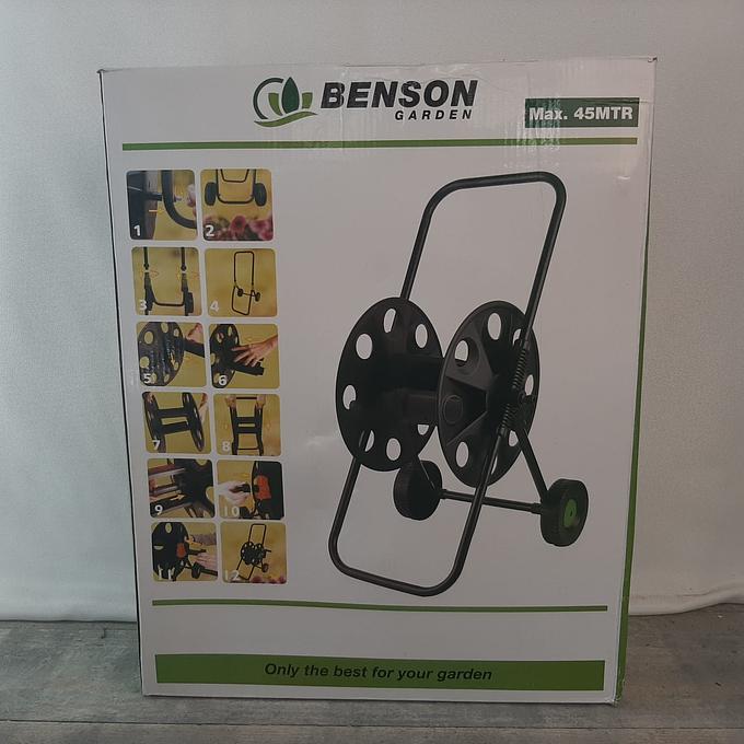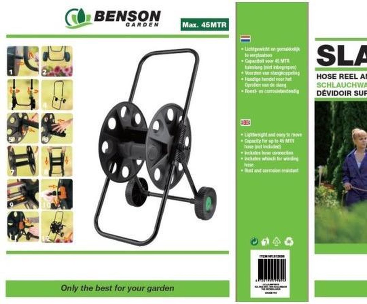 Productbeschrijving: Met de Benson Slangwagen wordt het opbergen en verplaatsen van uw tuinslang een stuk eenvoudiger. De lichtgewicht slangwagen is makkelijk te verplaatsen en biedt ruimte aan een tuinslang tot 45 meter (niet meegeleverd). Met de ingebouwde slangkoppeling sluit u de slang makkelijk aan op uw waterpunt. Dankzij de handige hendel rolt u uw tuinslang na gebruik ook weer snel en netjes op. De slangwagen is roest- en corrosiebestendig.