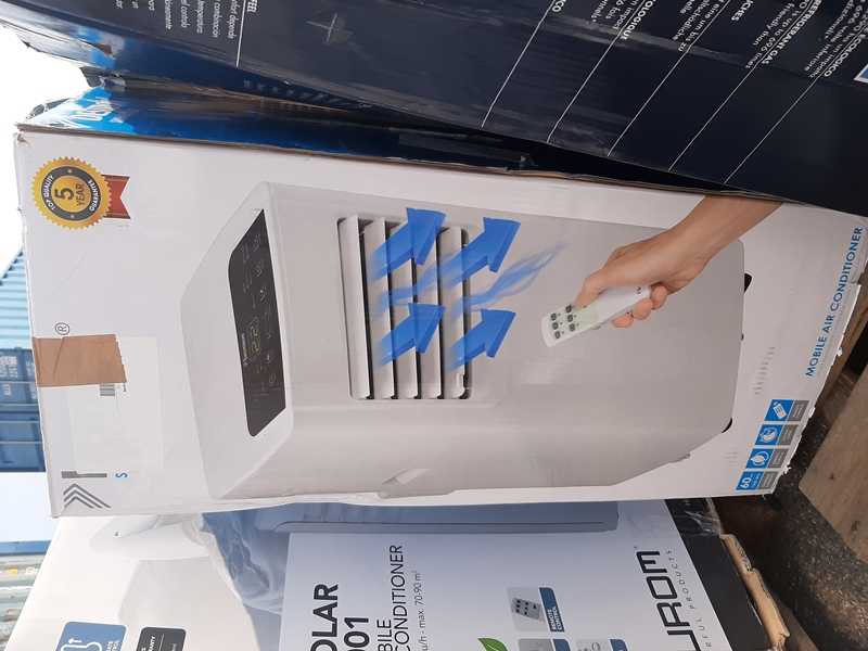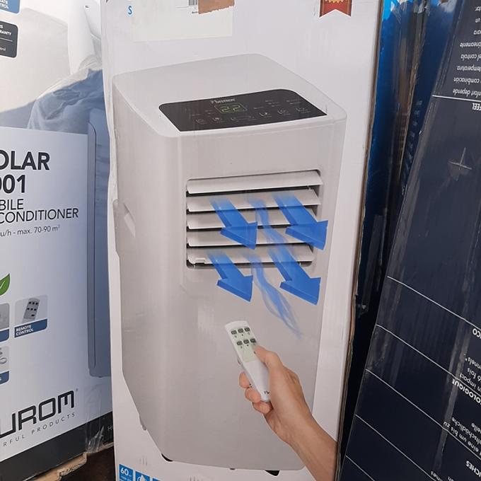 Voorzien van: luchtsverplaatsing van 300m3/h, maximale capaciteit van 120m3, koelvermogen van 12000 BTU en vermogen van 1435 Watt.