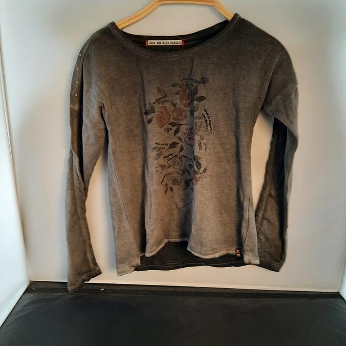 Productbeschrijving: Blue rebel trui met opdruk van bloemen en diverse teksten. De trui is gemaakt van katoen en is geschikt voor het voor- en najaar