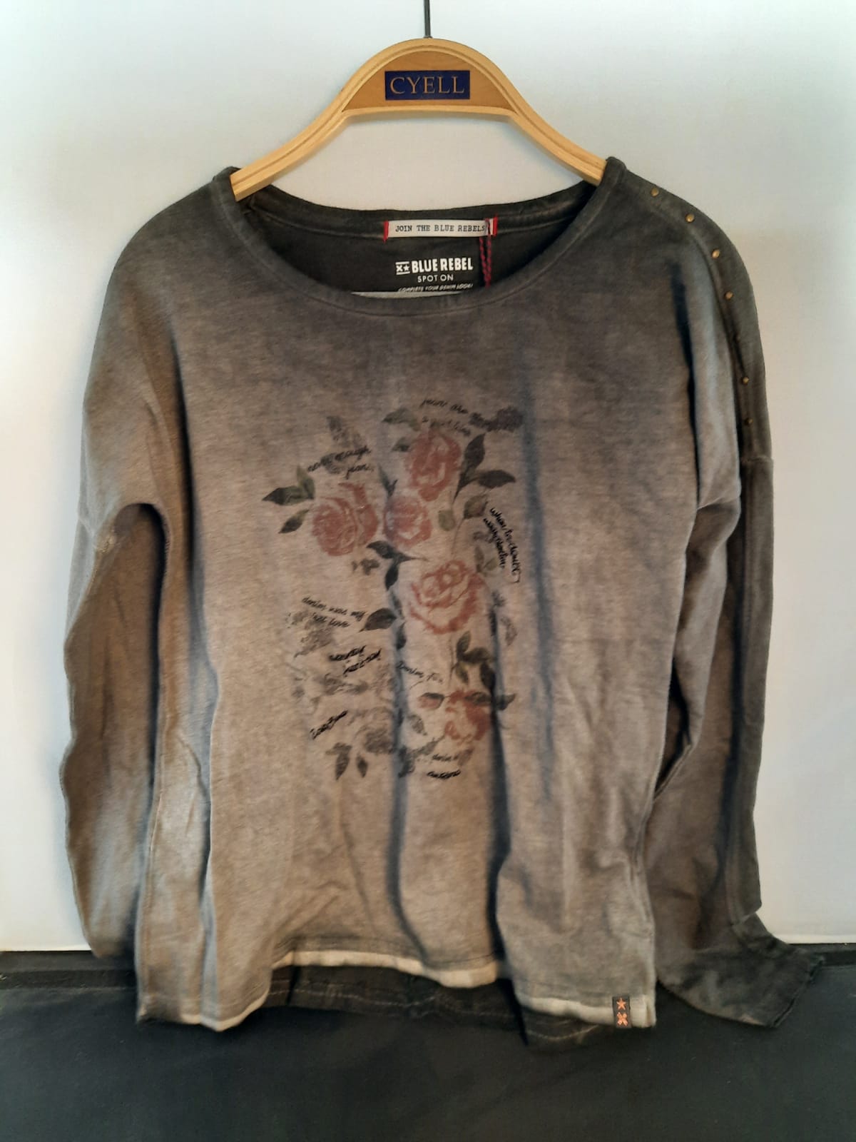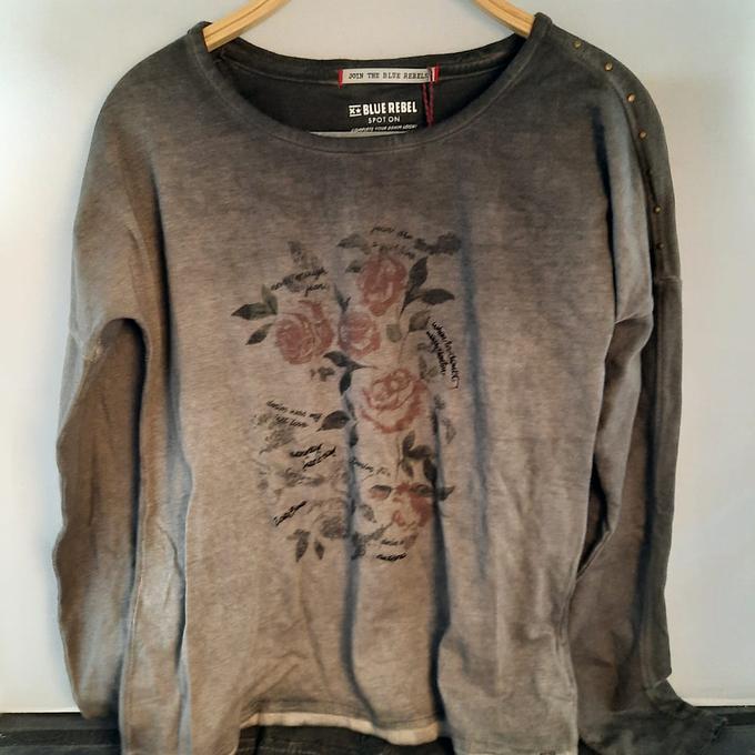 Productbeschrijving: Blue rebel trui met opdruk van bloemen en diverse teksten. De trui is gemaakt van katoen en is geschikt voor het voor- en najaar