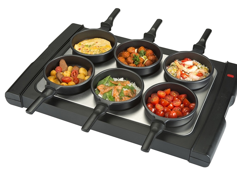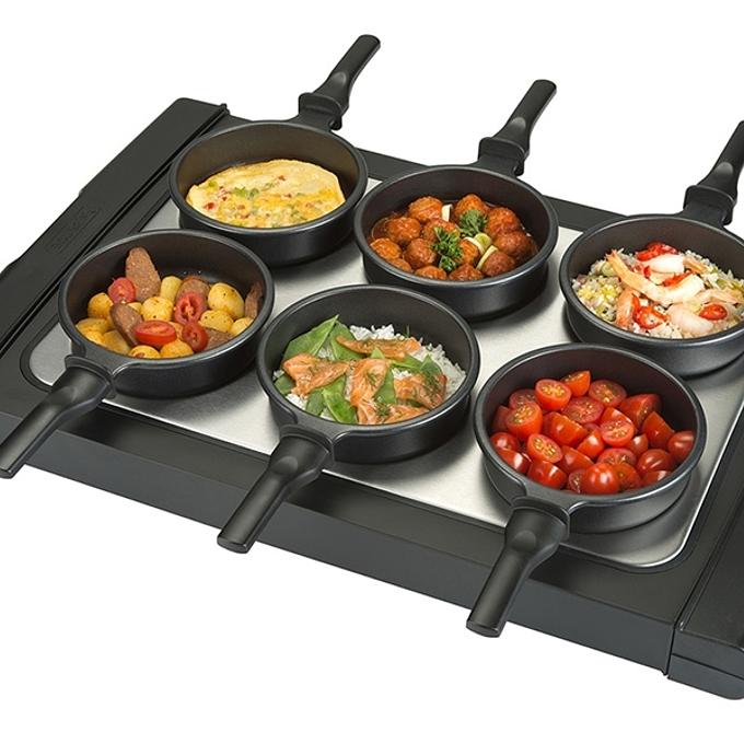 Productbeschrijving: De Bourgini Classic Fun-To-Cook 16.1020 is een multifunctioneel apparaat voor bakken, braden en koken aan tafel. De 6 aanwezige en kwalitatief hoogwaardige pannen zijn voorzien van een luxe Daikin antiaanbaklaag en extra lange steel, door de antiaanbaklaag zijn de pannen makkelijk schoon te maken. Krachtig is het apparaat bovendien met een vermogen van 1800 Watt: dus sneller en beter bakresultaat. De pannen hebben een doorsnede: 13 cm en een hoogte: 4 cm. De pannen zijn bovendien voorzien van een luxe Daikin antiaanbaklaag en extra lange steel en zijn vaatwasmachinebestendig. Inclusief 6 houten spatels en aan/uit-lampje. Geschikt voor 6 personen.