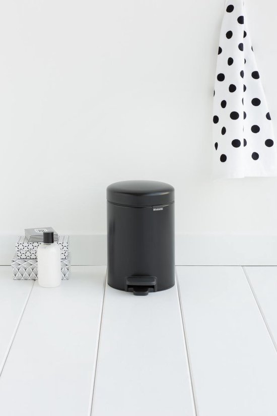 Productbeschrijving: Deze Brabantia newIcon Prullenbak - 3 l - Matt Black met kunststof binnenemmer is een schoonheid voor je badkamer of toilet. Brabantia’s newIcon pedaalemmers zijn niet alleen iconische schoonheden, ze zijn ook betrouwbare hulpjes in de huishouding. Stevig en altijd stabiel, dankzij hun antislip onderkant en anti-kantel blok.