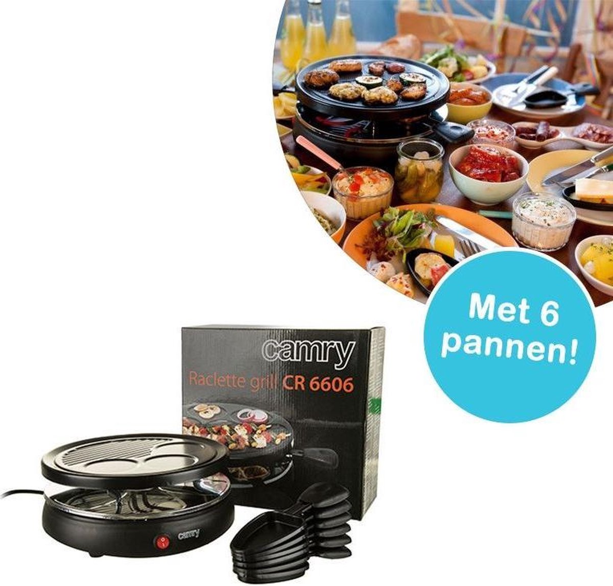 Productbeschrijving: Fraai en royaal Gourmet apparaat van Camry. Ook geschikt voor grillen en racletten! Dit Gourmet apparaat is voorzien van een vermogen van maar liefst 1200W. Dat betekent een snelle opwarmtijd en een betere kwaliteit van bakken. Ideaal voor elke Gourmet, maar ook ideaal als raclette apparaat! Daarnaast kunt u op de bakplaat ook van alles grillen (groente, vlees, vis etc..) Uitgerust met een grote afneembare grillplaat bedekt met een laag non-stick coating en 6 type gourmet/raclet pannen uitgerust met anti-aanbaklaag en ergonomische handgrepen. De raclette grill is eenvoudig te reinigen. Dankzij de anti-aanbaklaag, is er weinig boter of vet nodig.