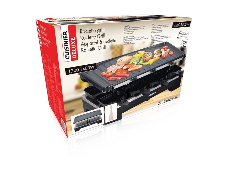 Deze gourmetset van Cuisinier Deluxe heeft bovenop een geribbelde bakplat. Daaronder kun je de pannetjes gebruiken (8 stuks inclusief).