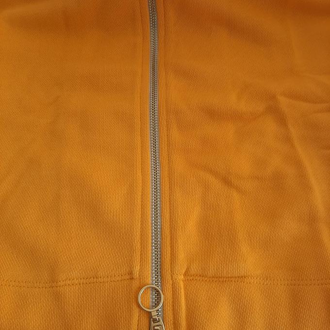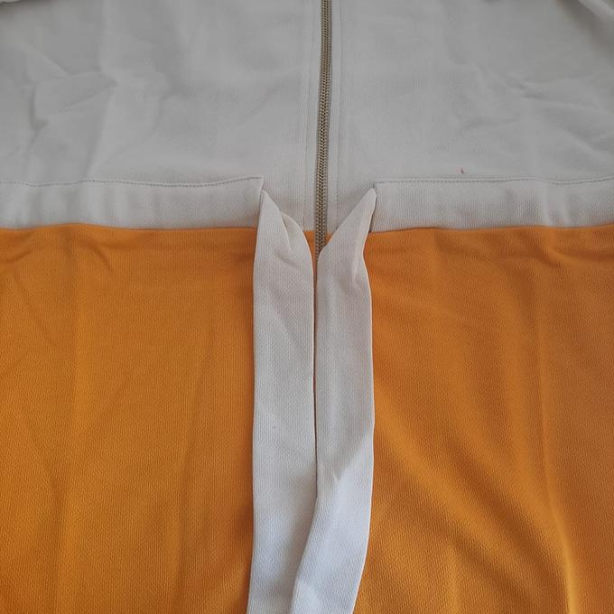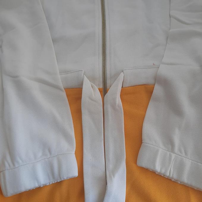 Productbeschrijving: Cyell Badjas lange mouw Radiant Yellow met rits. De badjas is wit aan de bovenkant en oranje/geel aan de onderkant.