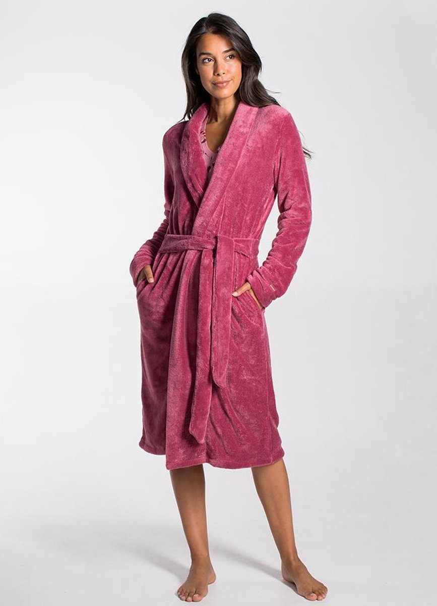 Productbeschrijving: Mauve badjas van super zacht fleece materiaal. De badjas heeft steekzakken, een strikband in de taille en valt tot op de knie.