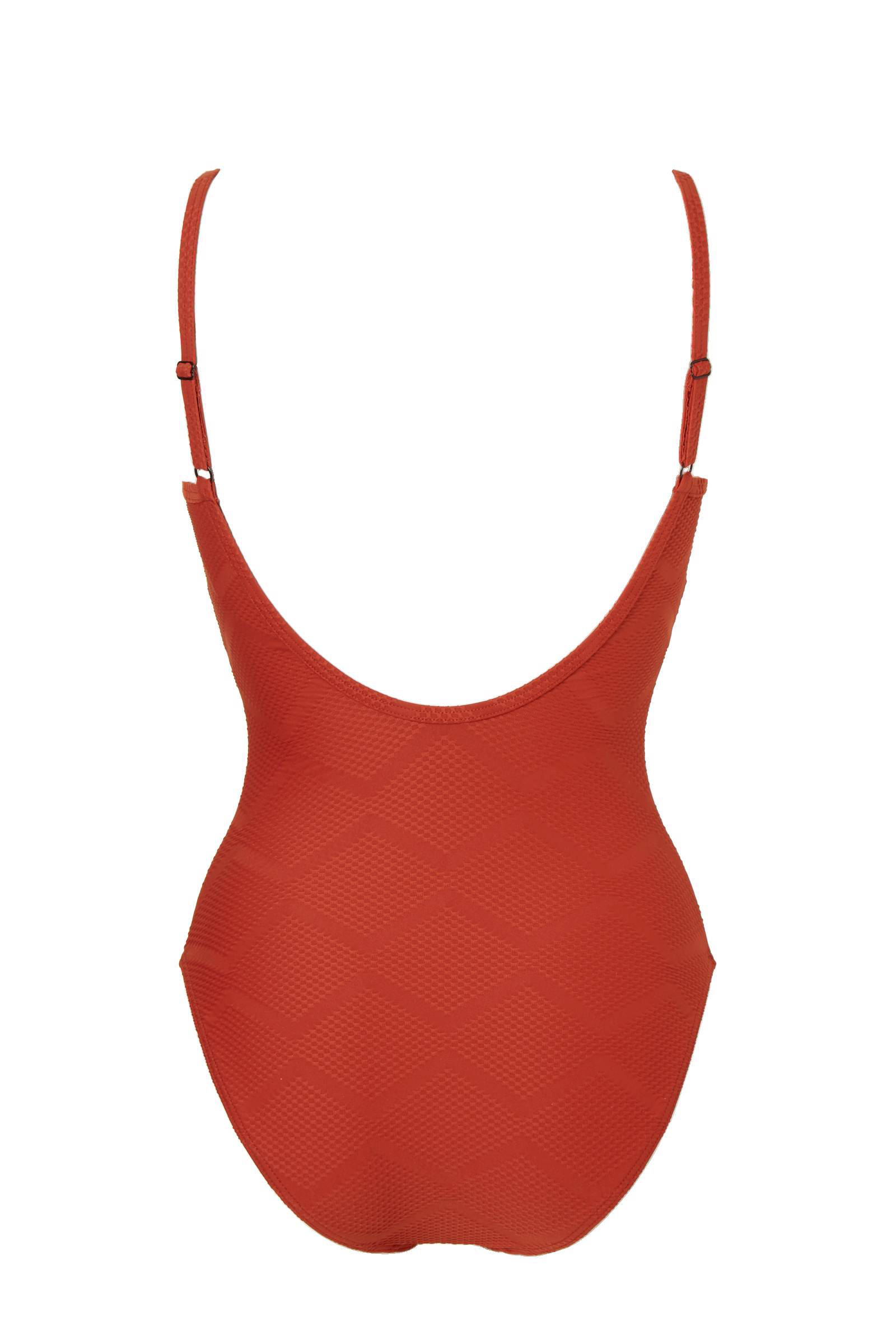 Productbeschrijving: Het Texture badpak van Cyell is uitgevoerd in een rode kleur. De stof van het badpak is voorzien van een mooie textuur. Tussen de cups is een speelse opening aanwezig. De schouderbandjes van het badpak zijn afgewerkt met een goud detail.