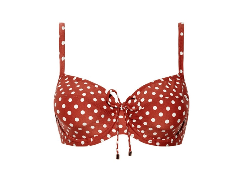 Productbeschrijving: Cyell Bikiniset Geisha chic Maat 38D en 38. Deze roestkleurige bikinitop met witte dots heeft aan de bovenkant van de cups een strikkoord zitten waarmee er een decolleté naar wens gecreëerd kan worden. Het broekje heeft een comfortabele hoge taille en kan doormiddel van de speelse touwtjes aan de zijkant van het broekje naar voorkeur versteld worden.