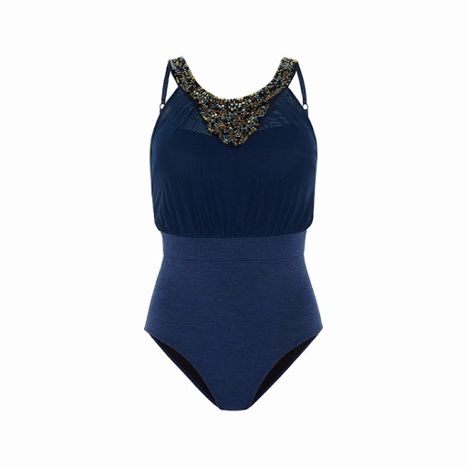 Productbeschrijving: Cyell Platinum Essentials navy 2018 luxe voorgevormd badpak Navyblauw, donkerjeansblauw prachtig versierd met vierkante kraaltjes in 2 tinten blauw en goud en zilver.