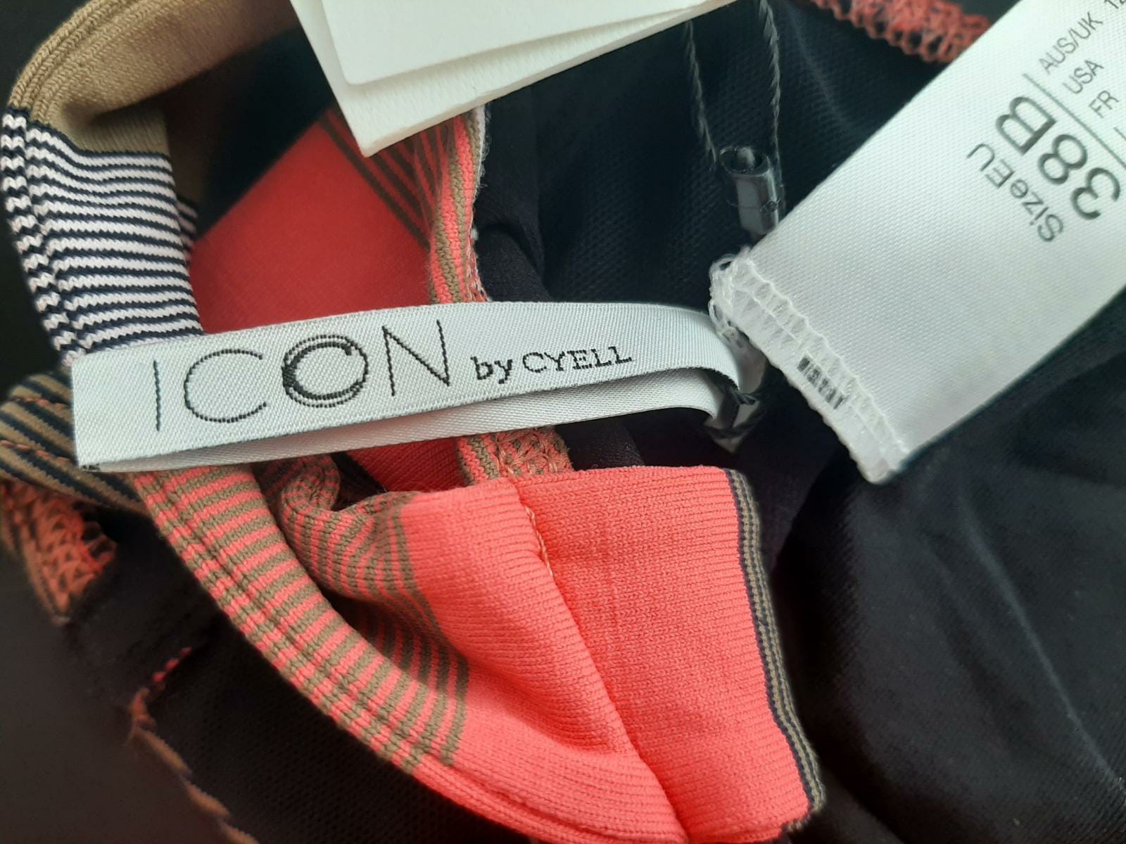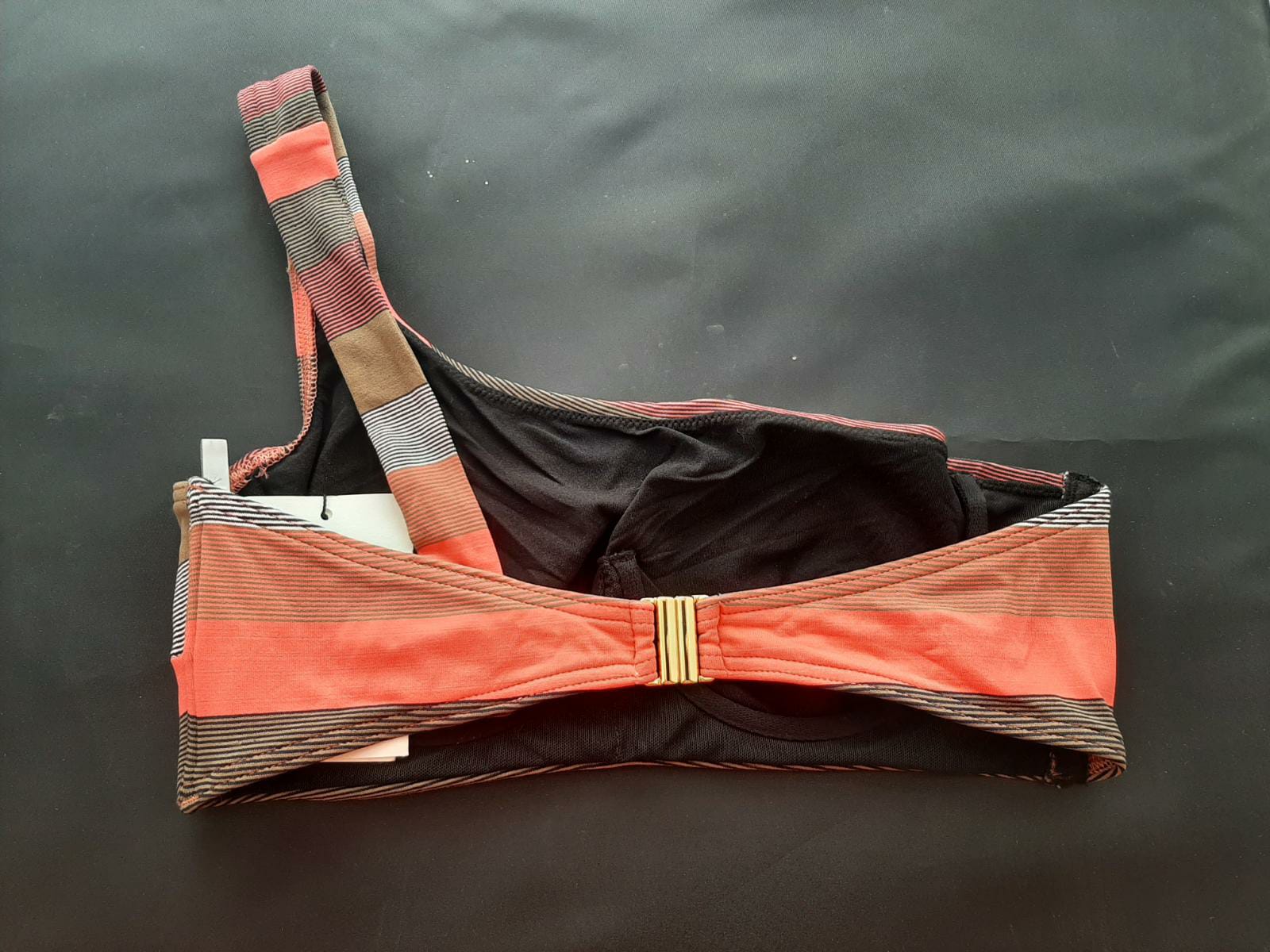 Productbeschrijving: ICON by Cyell serie sunrise splash.One shoulder bikinitop met structuur in de stof aan de voorzijde, beugels en goud kleurige sluiting aan de achterzijde. Maat valt normaal.