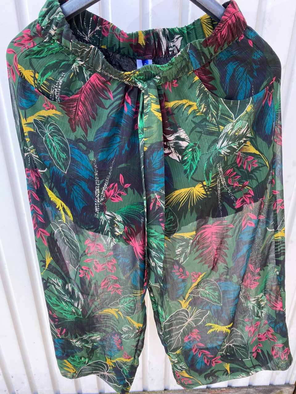 Productbeschrijving: Cyell Trousers Jungle Chic Peggy maat S is gemaakt van een comfortabele stof. De broek heeft een korter onderzittend broekje en de lange broek is gemaakt van een doorschijnende stof.