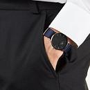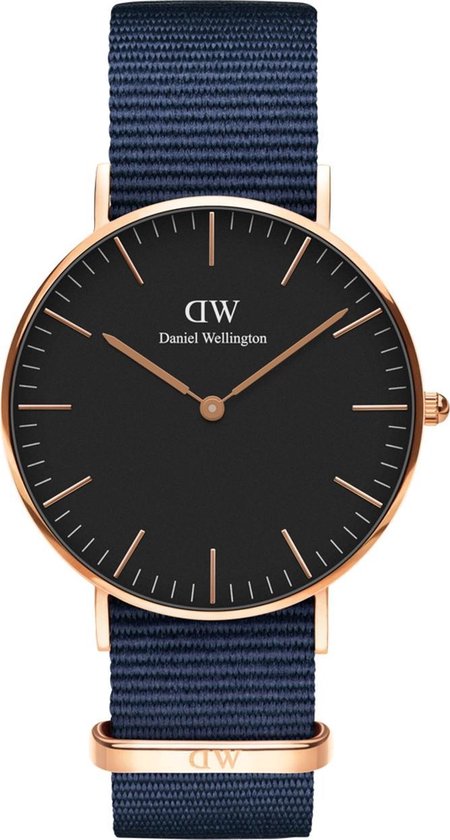 Productbeschrijving: Dit Daniel Wellington horloge met zwarte wijzerplaat (ø 36 mm) en rosegoudkleurige kast is een goede match voor iedere outfit. Door de klassieke klok en het sportieve blauwe NATO bandje is dit horloge geschikt voor zowel op kantoor als op de sportvelden.