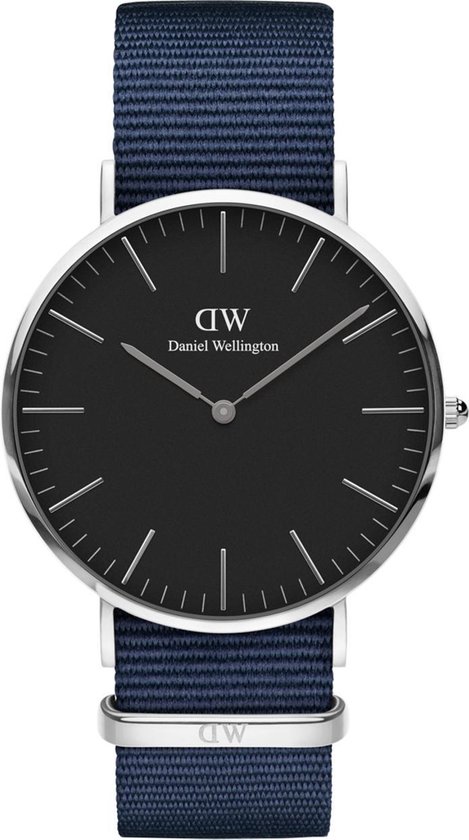Productbeschrijving: Dit Daniel Wellington horloge met zwarte wijzerplaat (ø 40 mm) en zilverkleurige kast is een goede match voor iedere outfit. Door de klassieke klok en het sportieve blauwe NATO bandje is dit horloge geschikt voor zowel op kantoor als op de sportvelden.