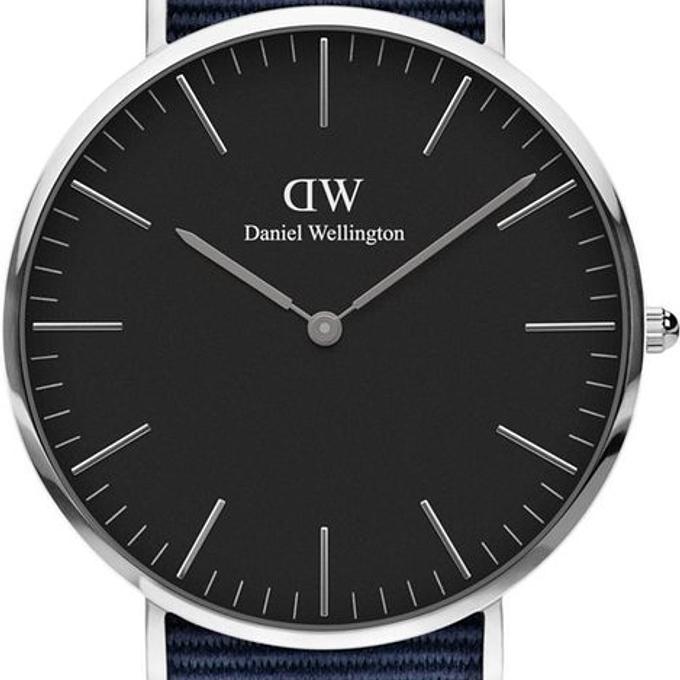 Productbeschrijving: Dit Daniel Wellington horloge met zwarte wijzerplaat (ø 40 mm) en zilverkleurige kast is een goede match voor iedere outfit. Door de klassieke klok en het sportieve blauwe NATO bandje is dit horloge geschikt voor zowel op kantoor als op de sportvelden.