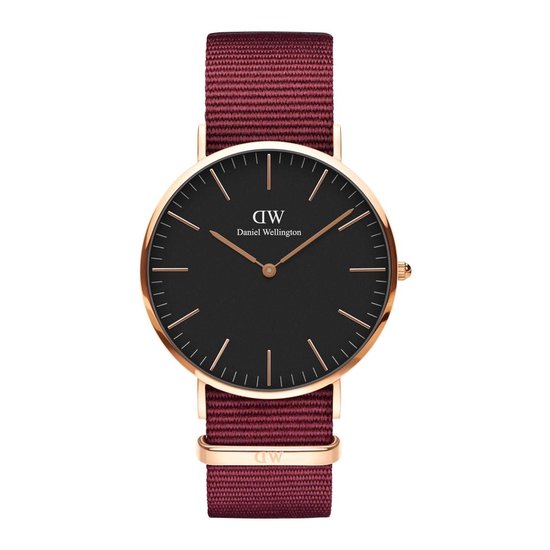 Productbeschrijving: Dit Daniel Wellington horloge met zwarte wijzerplaat (ø 40 mm) en rosegoudkleurige kast is een goede match voor iedere outfit. Door de klassieke klok en het sportieve rode NATO bandje is dit horloge geschikt voor zowel op kantoor als op de sportvelden.