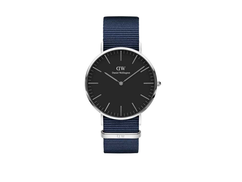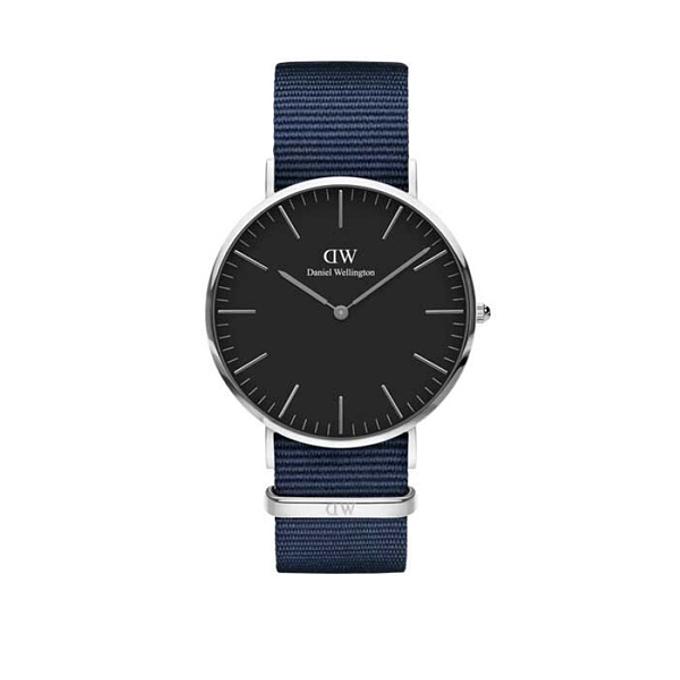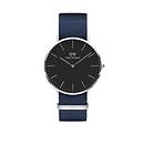 Productbeschrijving: Dit Daniel Wellington horloge met zwarte wijzerplaat (ø 40 mm) en zilverkleurige kast is een goede match voor iedere outfit. Door de klassieke klok en het sportieve blauwe NATO bandje is dit horloge geschikt voor zowel op kantoor als op de sportvelden.