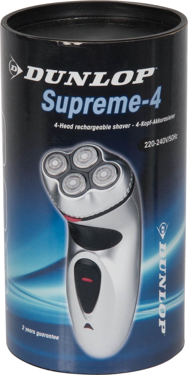 Productbeschrijving: Snel en gemakkelijk droogscheren doe je met de oplaadbaar Dunlop Supreme-4. De 4 flexibele scheerkoppen tillen de baarthaartjes op en scheren ze dichtbij de huid af. Zo kom je altijd gladgeschoren en fris voor de dag. Pop up trimmer Het scheerapparaat is ook voorzien van een pop up trimmer. Die zit verborgen aan de achterkant van het apparaat en kun je uitklappen. Met de trimmer kun je bijvoorbeeld je bakkebaarden netjes bijhouden of je baard of snor in model trimmen. 25 min. lang gebruiken Met een oplaadtijd van 30 min. kun je de Supreme-4 25 min. lang gebruiken. Je krijgt er een schoonmaakborsteltje en een handige opbergetui bij.