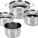 Productbeschrijving: De set bestaat uit drie pannen met deksel en een steelpan. Voorzien van een kunststof handvat. De handvatten worden hierdoor niet warm.