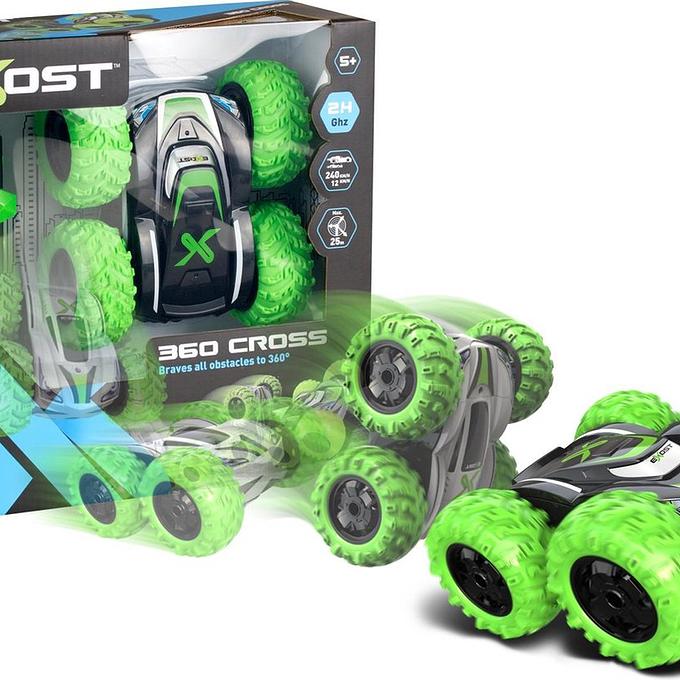 Productbeschrijving: Deze 360 Cross van Exost is met zijn groene banden een echte eyecatcher. Hij kan 360 graden spinnen, een flip maken en op twee kanten rijden. Met de eenvoudig te besturen controller houd jij de stuntauto altijd recht.