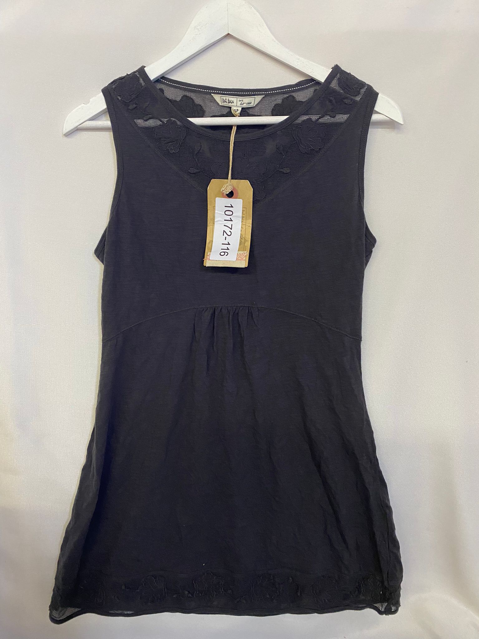 Productbeschrijving: FatFace jurkje Aneria Applique Tunic in maat S is mouwloos en heeft een elastieken taile en kanten details.
